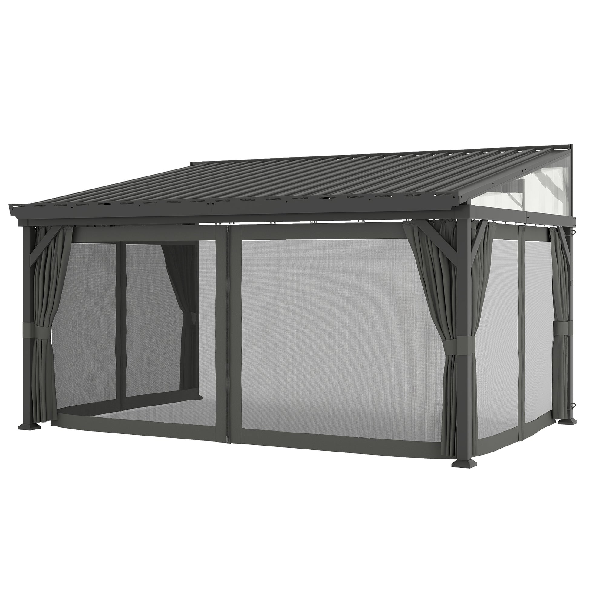 Outsunny 4.3 x 3 m Garden Pergola with Galvanised Steel Roof, Lean to Pergola Gazebo with Netting Curtains, Dark Grey