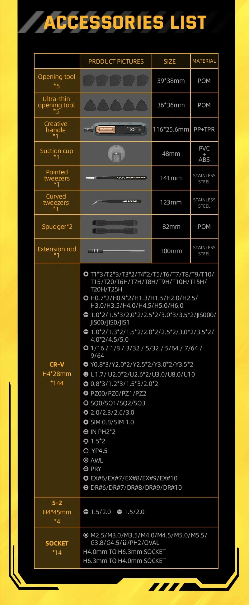 Multi-Functional Accessories: Besides screwdriver bits, the set is enriched with multiple accessories including opening tools, tweezers, spudgers, and an extension rod. These tools make sure you're prepared for every scenario.
