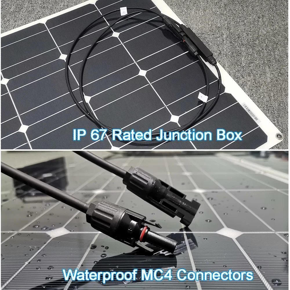 Owing to its 0.1inch thickness and weighing just 4.45 pounds,this 100w flexible solar panel boasts a unique frameless design.You can be fixed onto the desired surface by glue, tape, grommet, or Velcro.This design ensures easy installation.Six metal-reinforced mounting holes for fixing screws,hanging and removing the panel while allowing easy transportation.