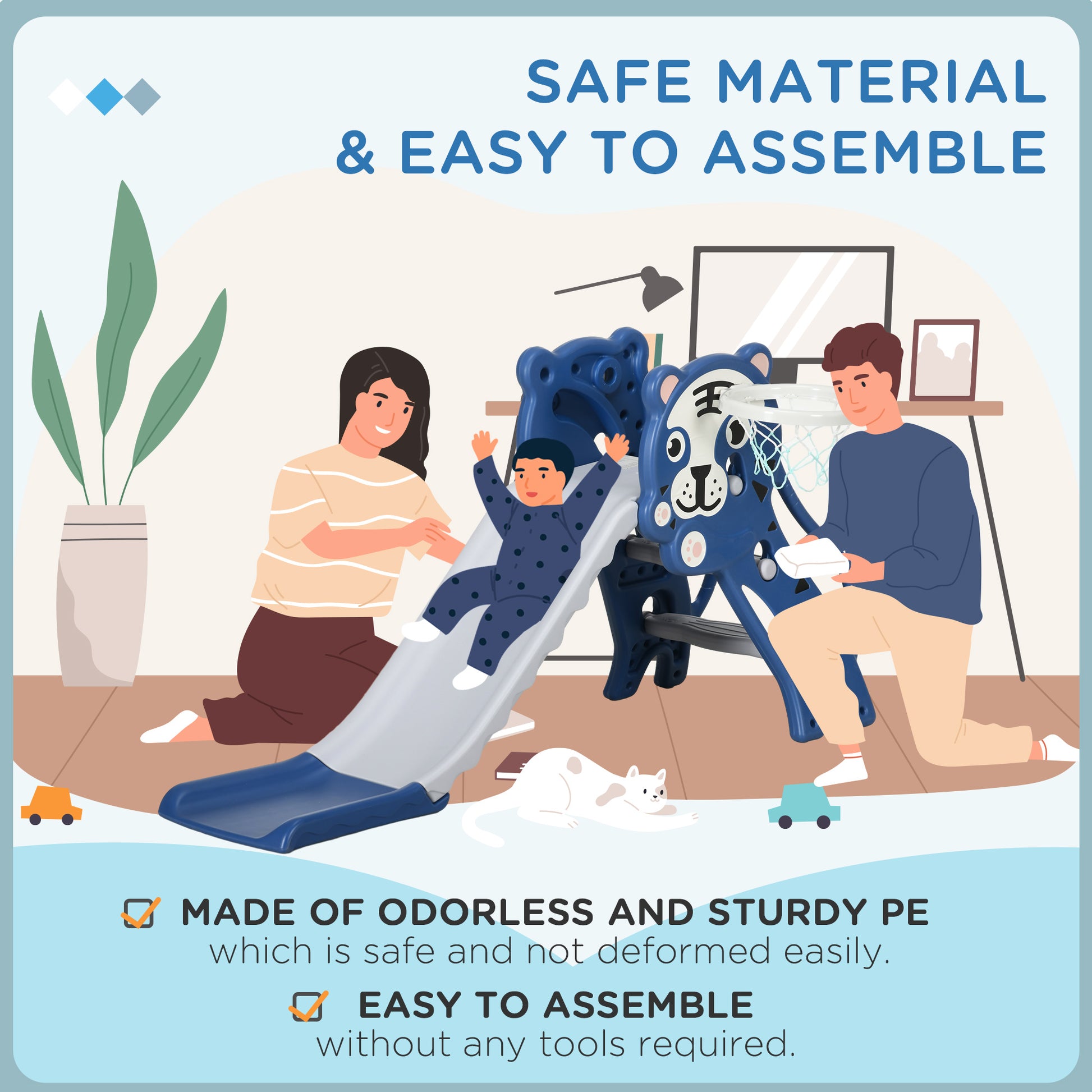 Introducing this exciting kids slide from AIYAPLAY, turning your home into a wonderful playground. A charming tiger-themed design with a blue body, it adds a fun and playful touch to your child's play area. More than just a slide, there's a basketball hoop on the side for extra fun and games. Assembly is a breeze, taking just 10 minutes. Elevate their playtime with this practical side – where safety, creativity and fun merge into a delightful experience.