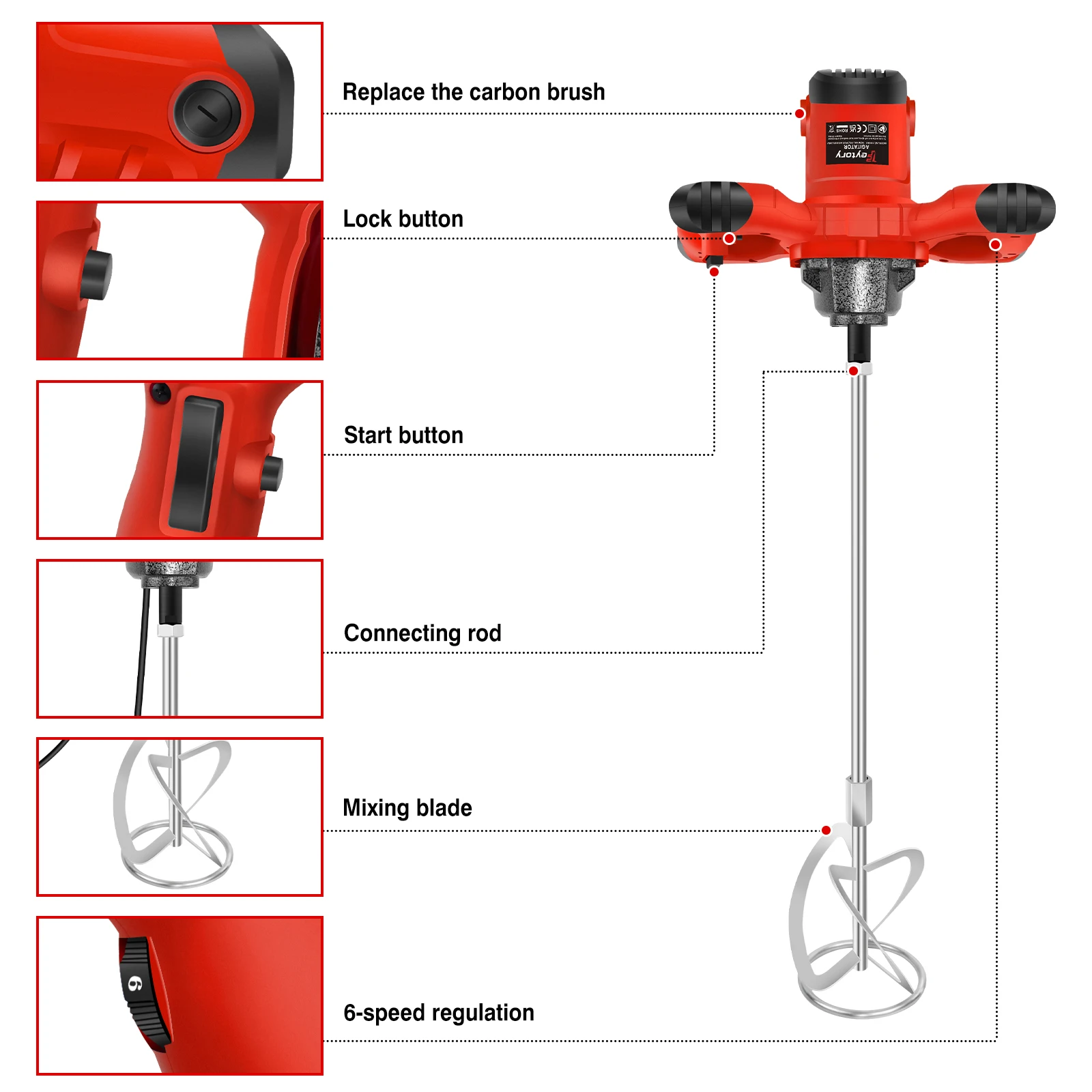 Cables: 2m, High temperature resistant motor, and comes with some heat dissipation holes on the back of the cement mixer, it can efficiently dissipate heat. High quality copper wire for durable work. The winding of electrical machinery ensures stable work and long service life.