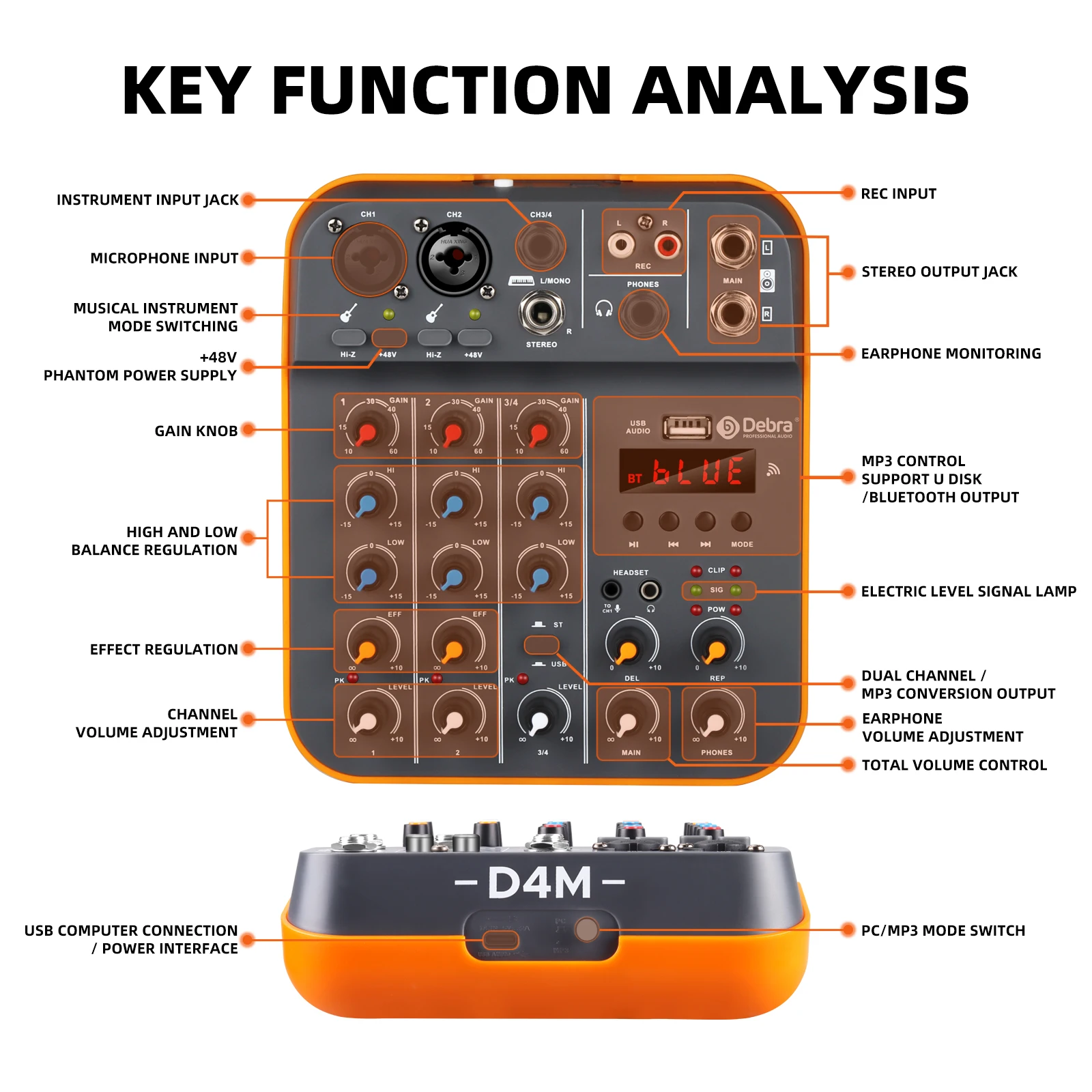 Debra Audio D4M 4-channel audio mixer is a portable mini audio interface, it uses 5V power supply for outdoor use. D4M has built-in Bluetooth and MP3, as well as standard 48V power supply, digital reverb effect and dual headphone jacks (3.5mm & 6.5mm), each channel has 3-segment equalisation adjustable, when using USB to connect to the computer, professional sound card output Let you obtain high-quality recording, whether it is personal indoor recording or small performance, D4M will be your most cost-effective small mixer.