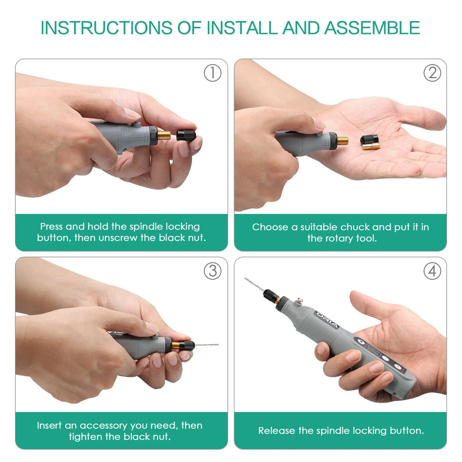 2.Insert the accessories you need and tighten the nut clockwise;