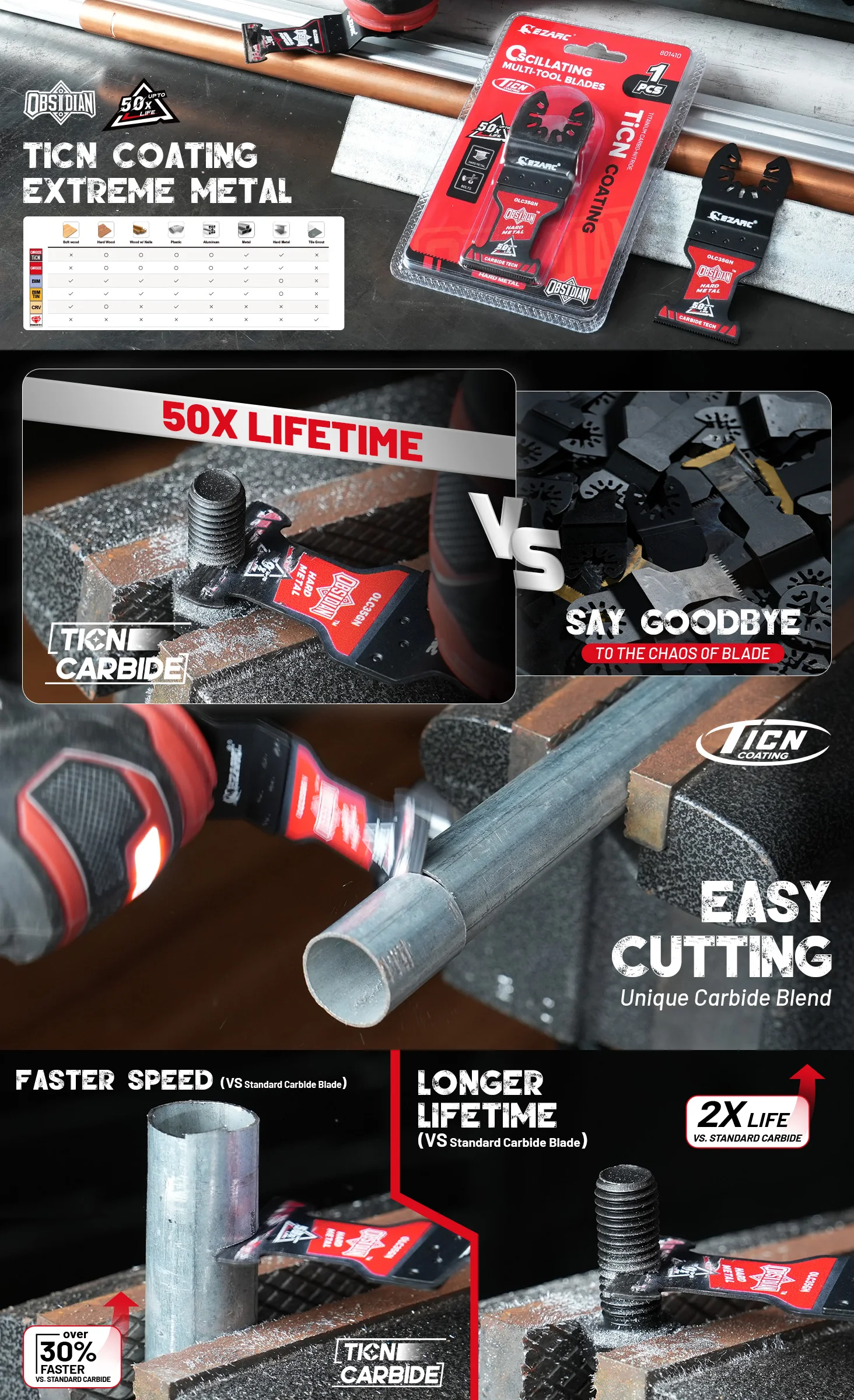 EZARC carbide oscillating saw blade is designed for heavy metal cutting applications like masonry nails, thick metal, screws, wood & nails, bolts, rebar, copper pipe. Lasts up to 50x longer than standard bi-metal multi tool blades.