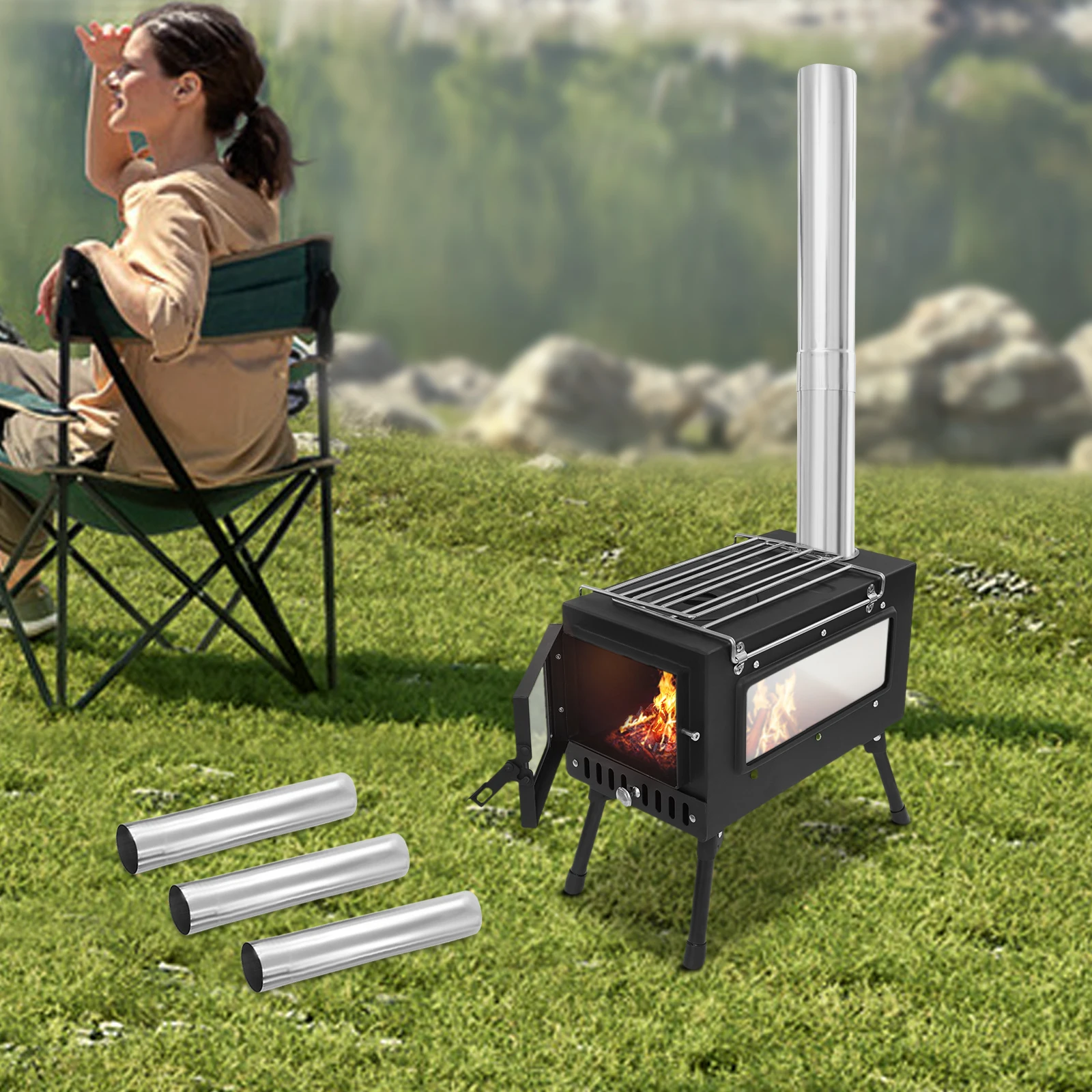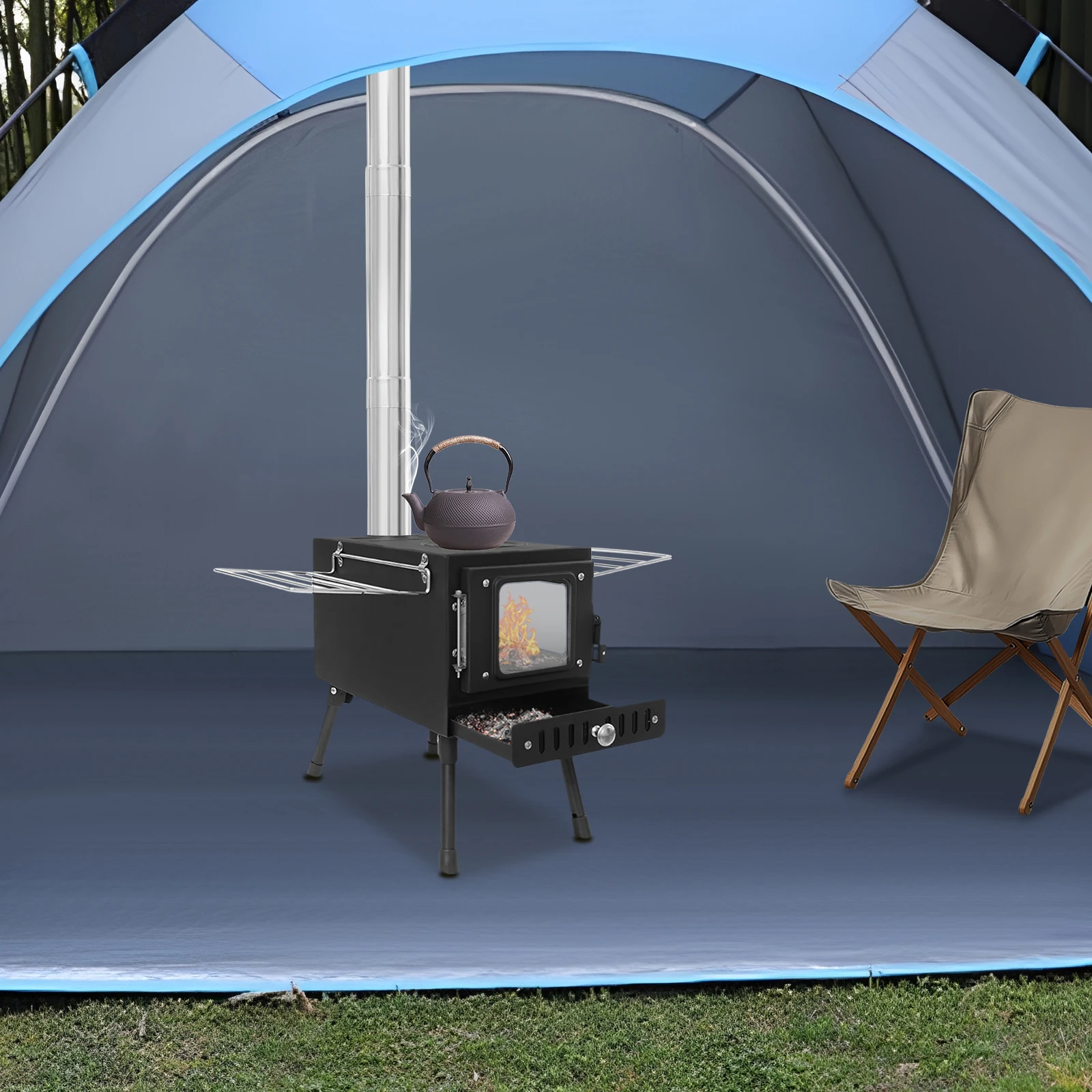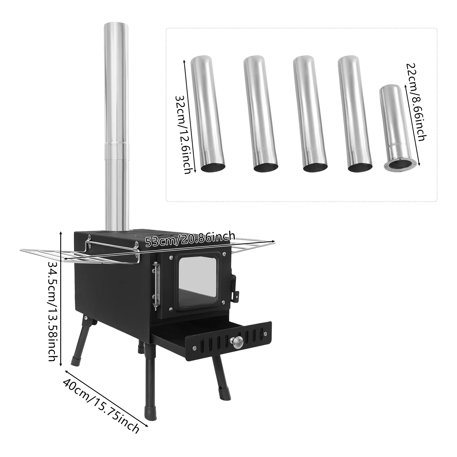 Compact wood-burning tent stove engineered for serious outdoor enthusiasts. Built from carbon steel and 201 stainless steel with high-temperature spraying, this foldable heater delivers dual functionality—warmth and cooking—in one robust unit. The modular chimney system (5 sections, 4.4ft total height) adapts to your tent, efficiently venting smoke whilst keeping interior air fresh. Observe combustion through heat-resistant glass panels, adjust airflow via exhaust vents, and manage fuel consumption with precision. The removable ash tray simplifies maintenance, whilst the multi-function shelf unfolds for storage or folds as a carry handle. Includes ash tray, 5 chimney pipes, protective gloves, stove lid, hook tool, and screwdriver. Supports up to 88 lbs. Compact when folded (15.75 × 20.87 × 13.58 inches), ideal for camping, hunting, and wilderness exploration. Assembly required. Fuel type: wood or charcoal (not supplied). Follow safety guidelines—maintain distance from flammable materials, ensure adequate ventilation, and allow natural cooling after use.
