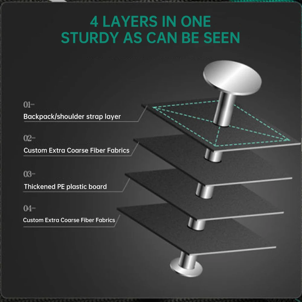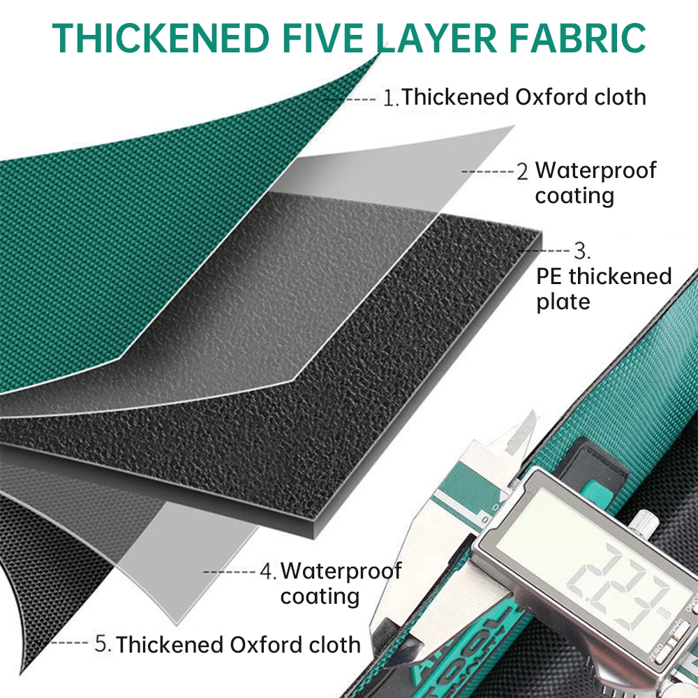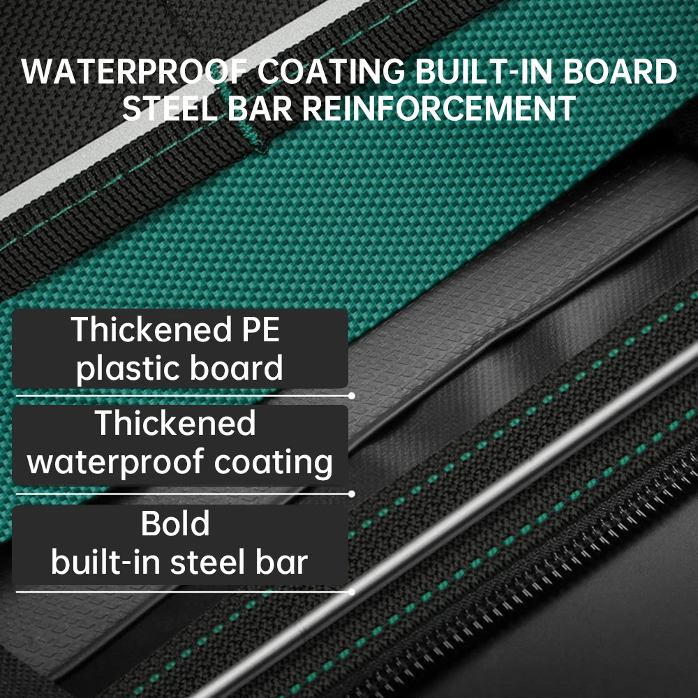 Nine features: thickened plastic bottom, 1680D Oxford cloth, larger space, splash-proof, tear-resistant, rub-proof, built-in partition pockets, warning reflective strips, steel nail reinforcement