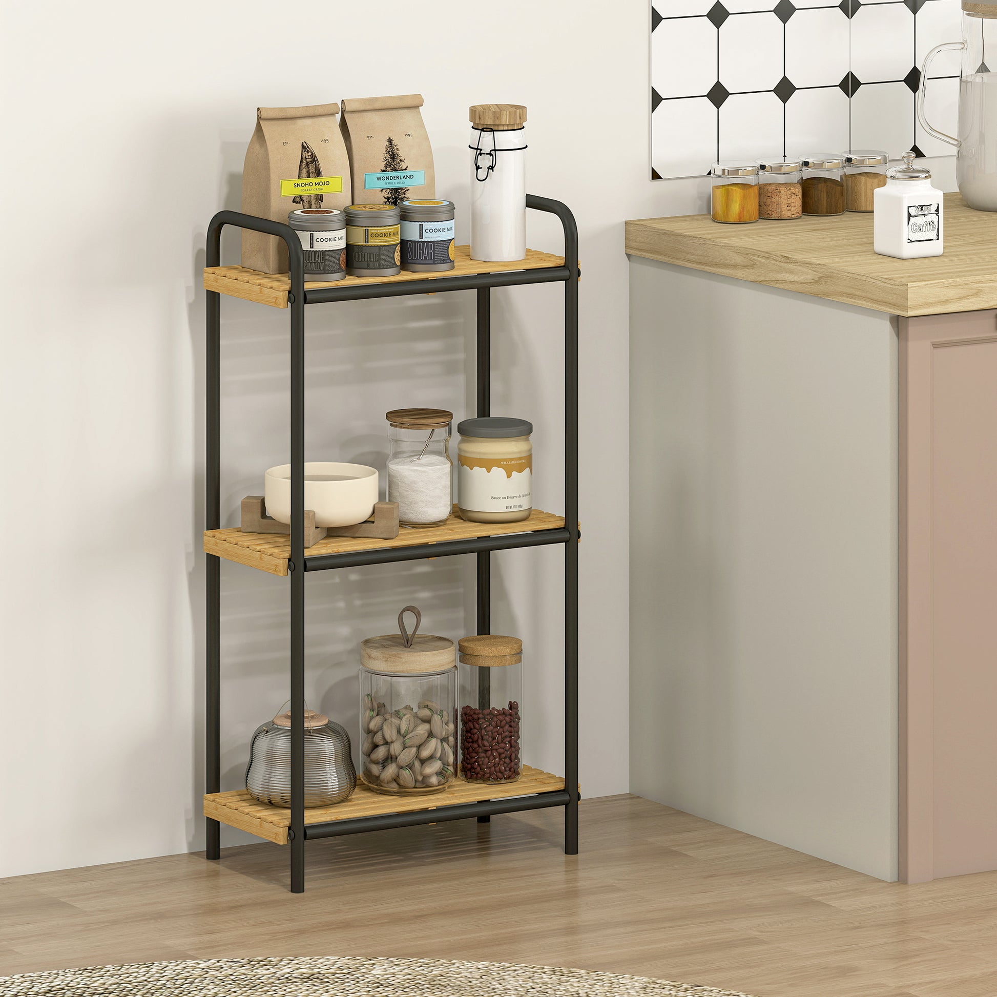 3-Tier Bamboo Bathroom Storage Shelf, Freestanding Narrow Shelving Unit with Slatted Shelves for Kitchen Bathroom Living Room, 41.5 x 21.5 x 77.5 cm, Natural and Black