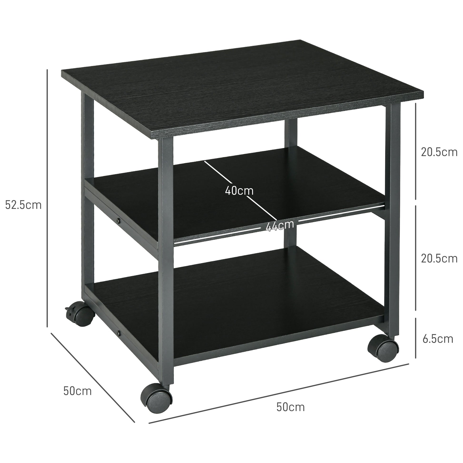 Discover the printer stand from HOMCOM, the space-saver for your home office! With its 3-tier shelf design, this printer table stand not only keeps your printer accessible next to your desk but also glides easily under the desk on four wheels (two with brakes) when not in use. Crafted from melamine coated particleboard and a painted steel frame, this HOMCOM office storage blends functionality with style, making office storage a breeze.