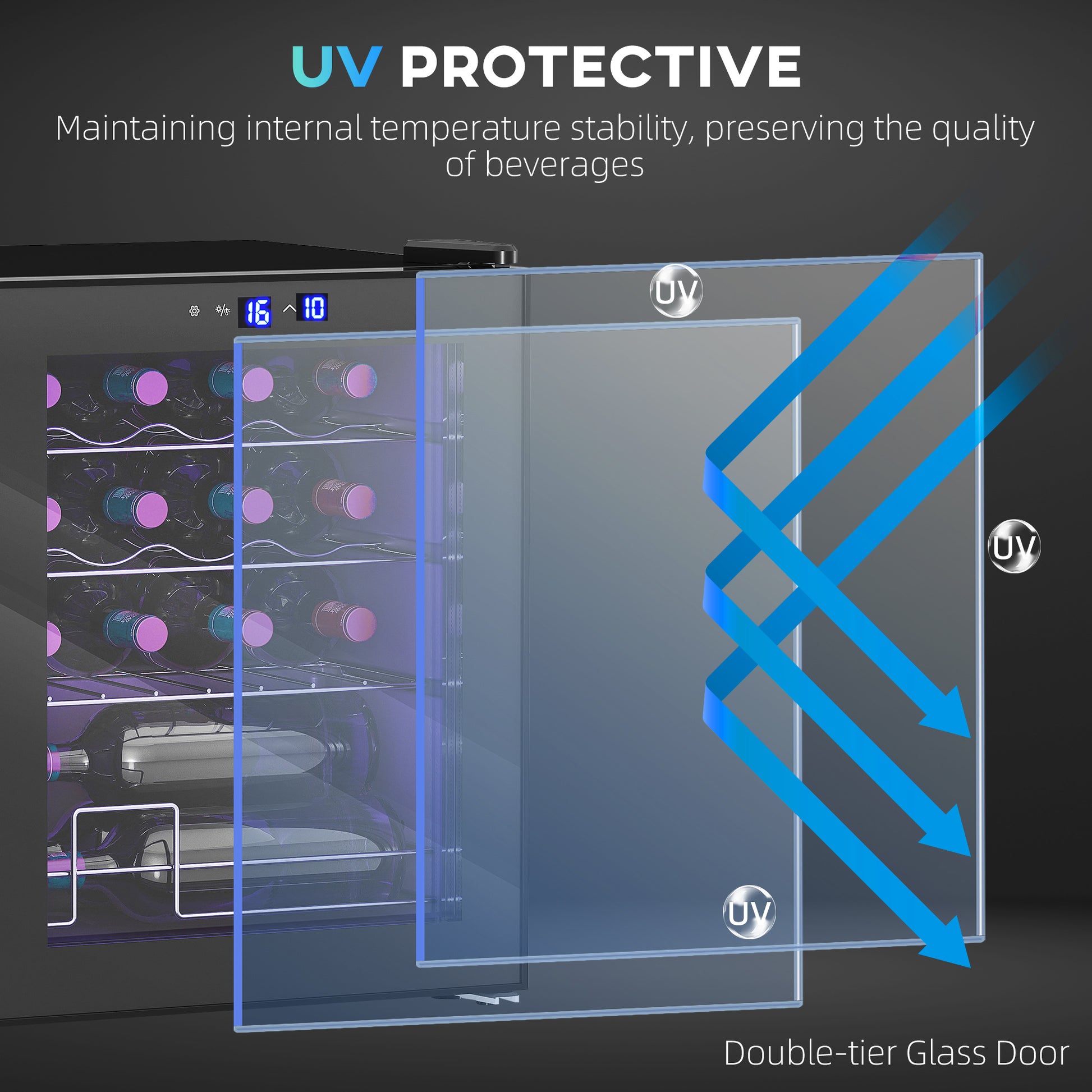 - Double-layer glass door blocks UV rays to protect inner contents. Blue light to see inside easily