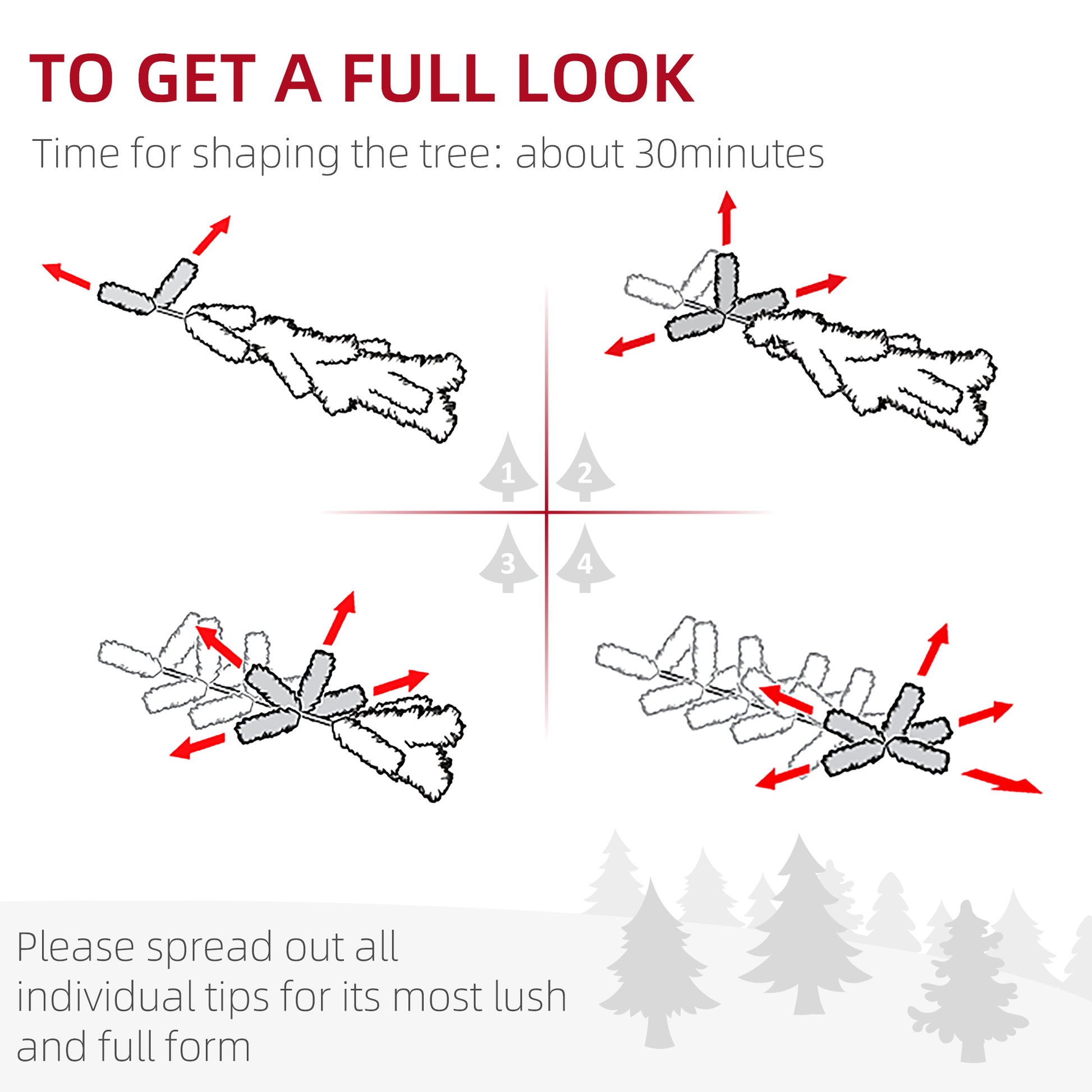 - Note: To get a full and bushy appearance, please remove and spread out all individual tips to get the best possible look from the tree