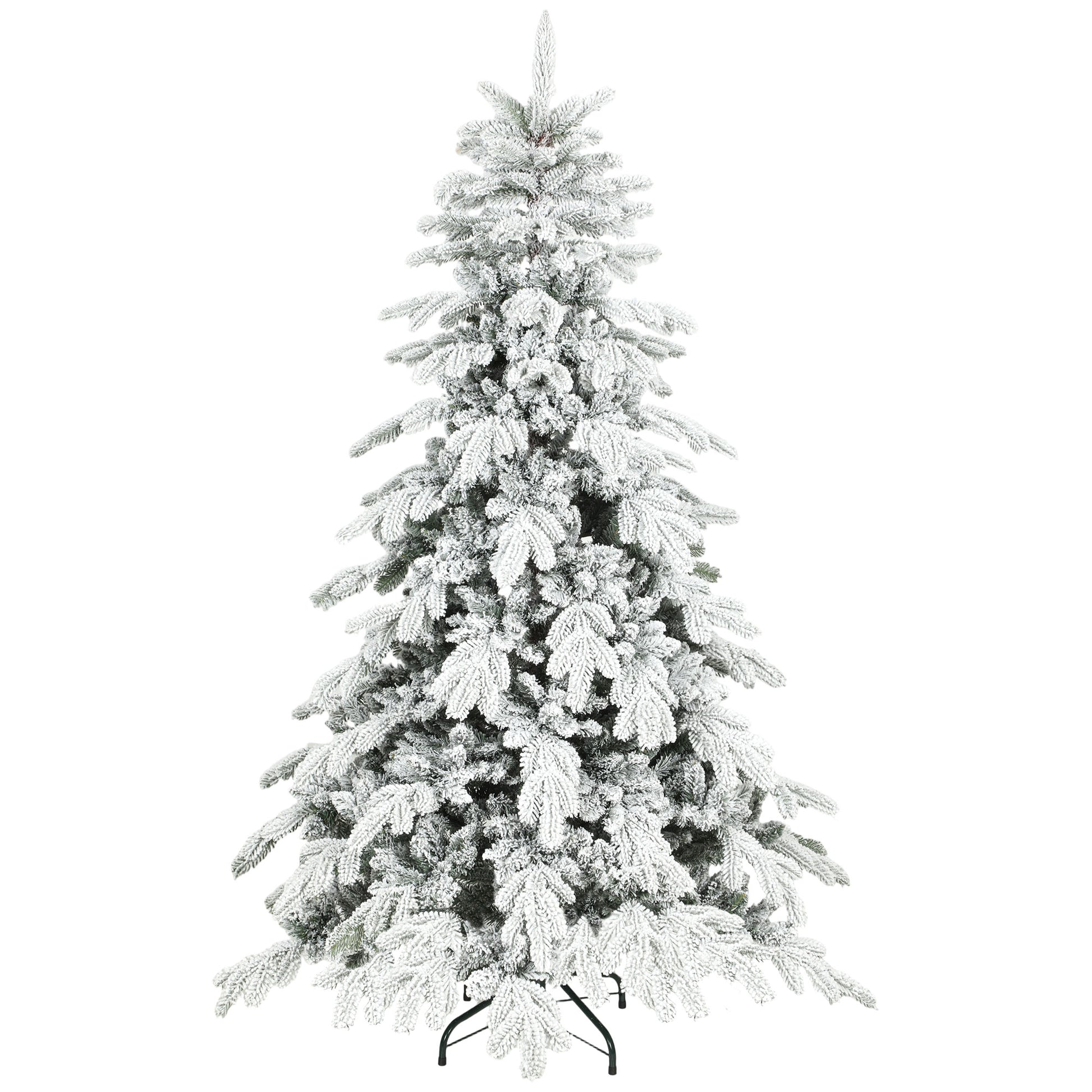 This Christmas, create a serene winter wonderland - in your own home, with this HOMCOM artificial Christmas tree. Sporting lush green branches in faux snow flocking, this is a wide and voluptuous piece: suitable for the season. The pre-attached hinges mean all you have to do is shape the tree quickly - frees up your time for family. The fire-resistant design offers peace of mind in the home (just don't expose close contact to naked flames!). Complete with a folding metal base.