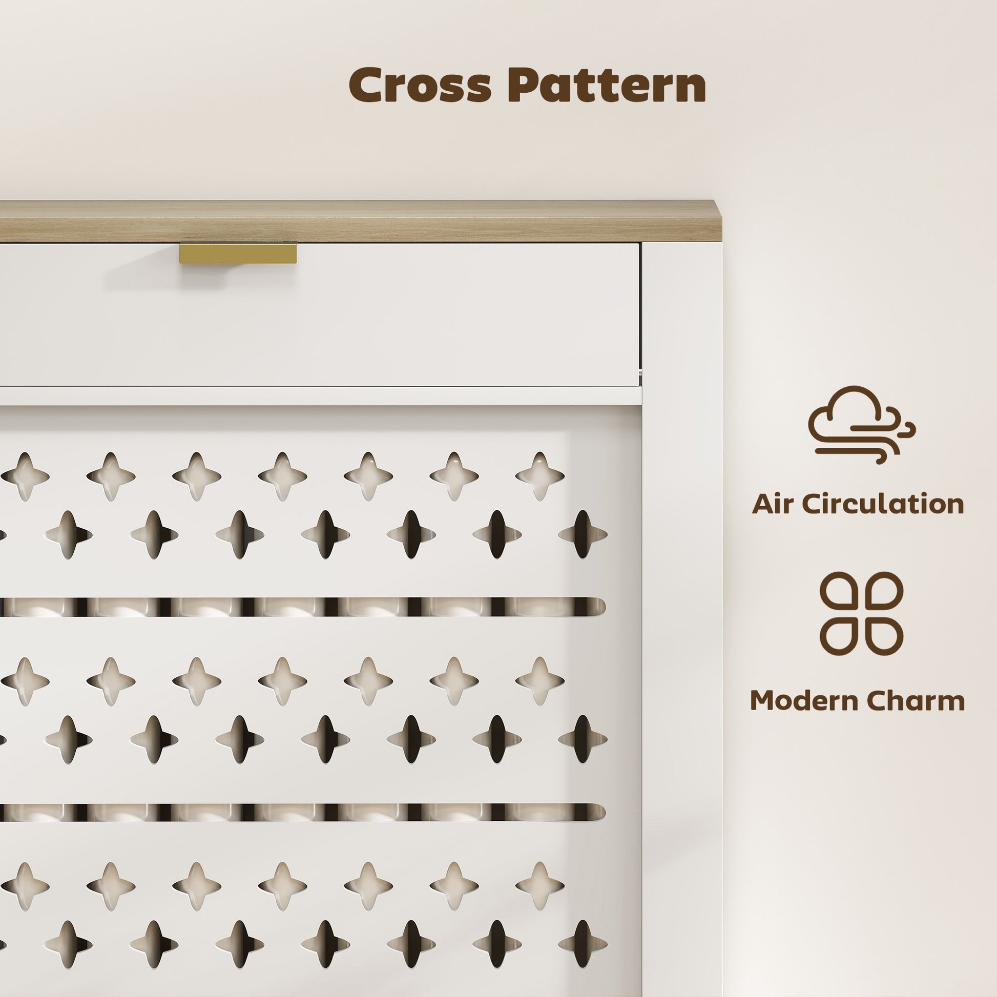Safety ensured around radiators with this HOMCOM protective cover. Made from a particle board and MDF blend, this is a reliable piece made for everyday use; it comes in a white body with a wood-effect for a simple design which looks great in plenty of different interior styles. The front cross cut-outs ensure heat can escape from the cover - so you can actually feel your radiator and keep warm as normal. It's complete with a top drawer for discreet storage.