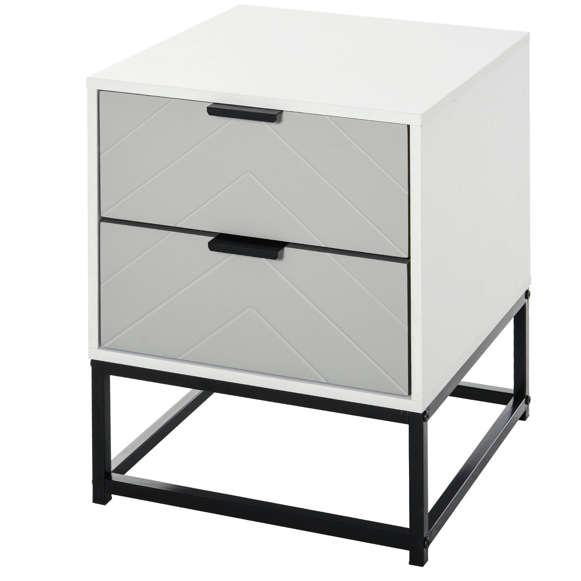 Keep stylish bedroom storage at the top of its game with this bedside table from HOMCOM. It's made with two drawers to give you handy storage room for all your bedtime essentials, with the inner metal runners and handles making them easy to open and close. The neutral grey and white colour scheme is versatile, with each drawer featuring an embossed chevron pattern for a unique look which will stand proudly for years to come. A large metal frame on the bottom to keep the table steady and protecting the bottom from damage. Subtle and unique styling done at its best.