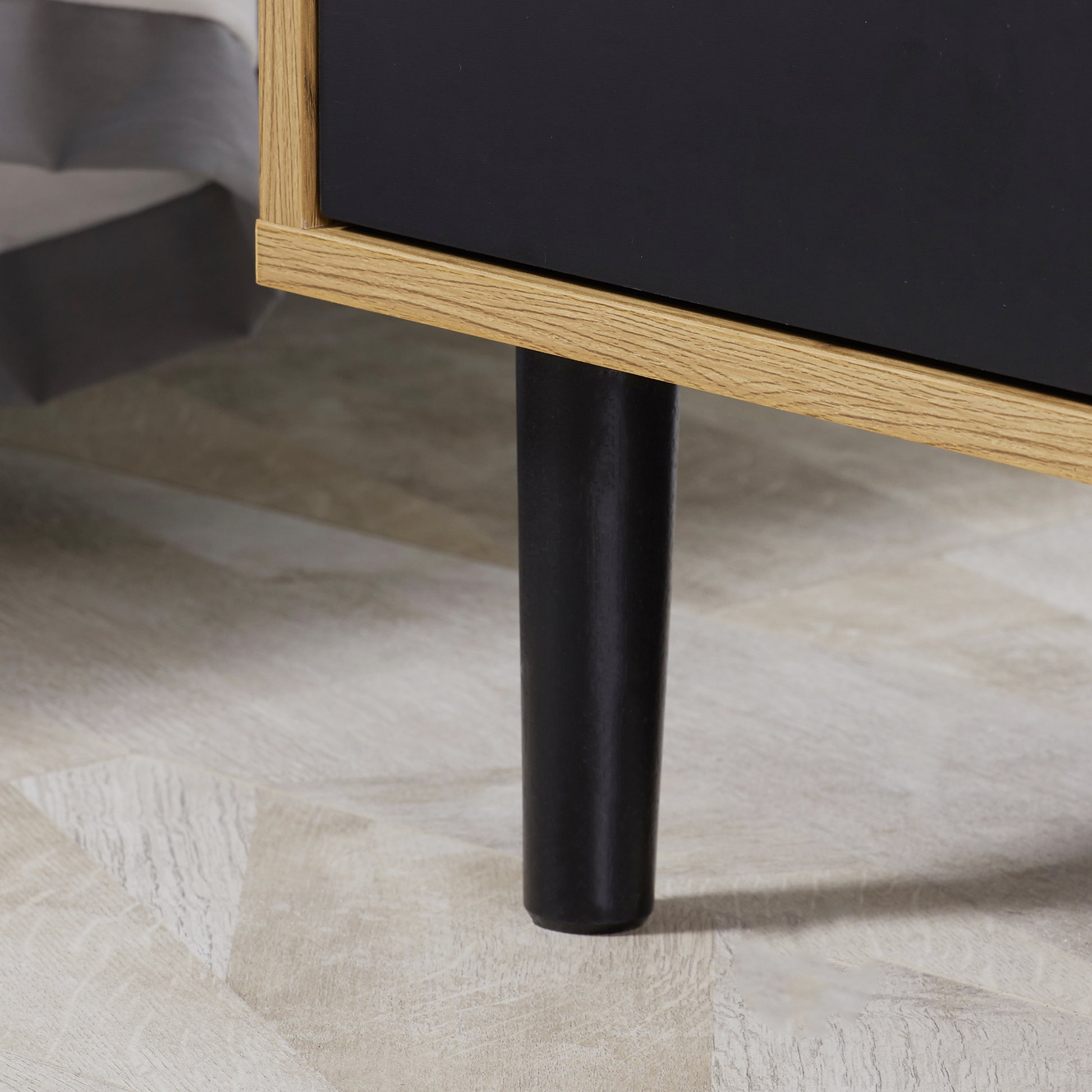 - Two slated-panel drawee and bottom black drawer for a stand-out look