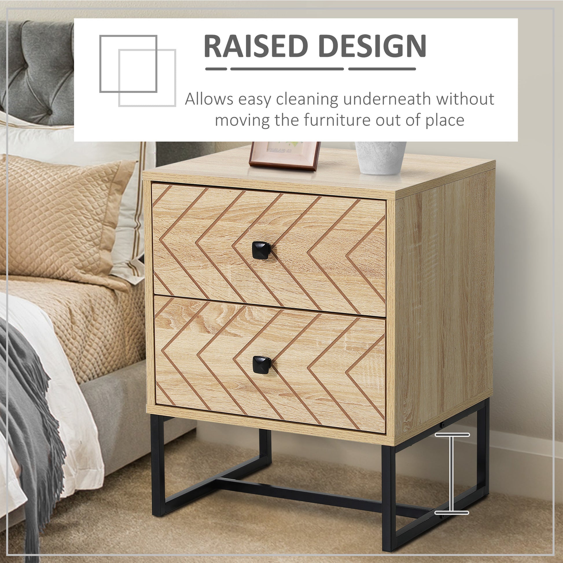 Bring character into your bedroom with this two-draw bedside table from HOMCOM. Built from a blend of MDF and particleboard for long term use, it is covered in a zig-zag design, making it a quirky and unique addition to your furniture you’ll love for years to come. A metal frame sits on the bottom, keeping the unit stable and helping to prevent damage, with anti-slip pads so it doesn’t move easily. It is finished with black handles on the draws, ensuring they are easy to open and close, as well as adding a sophisticated touch to the unit.