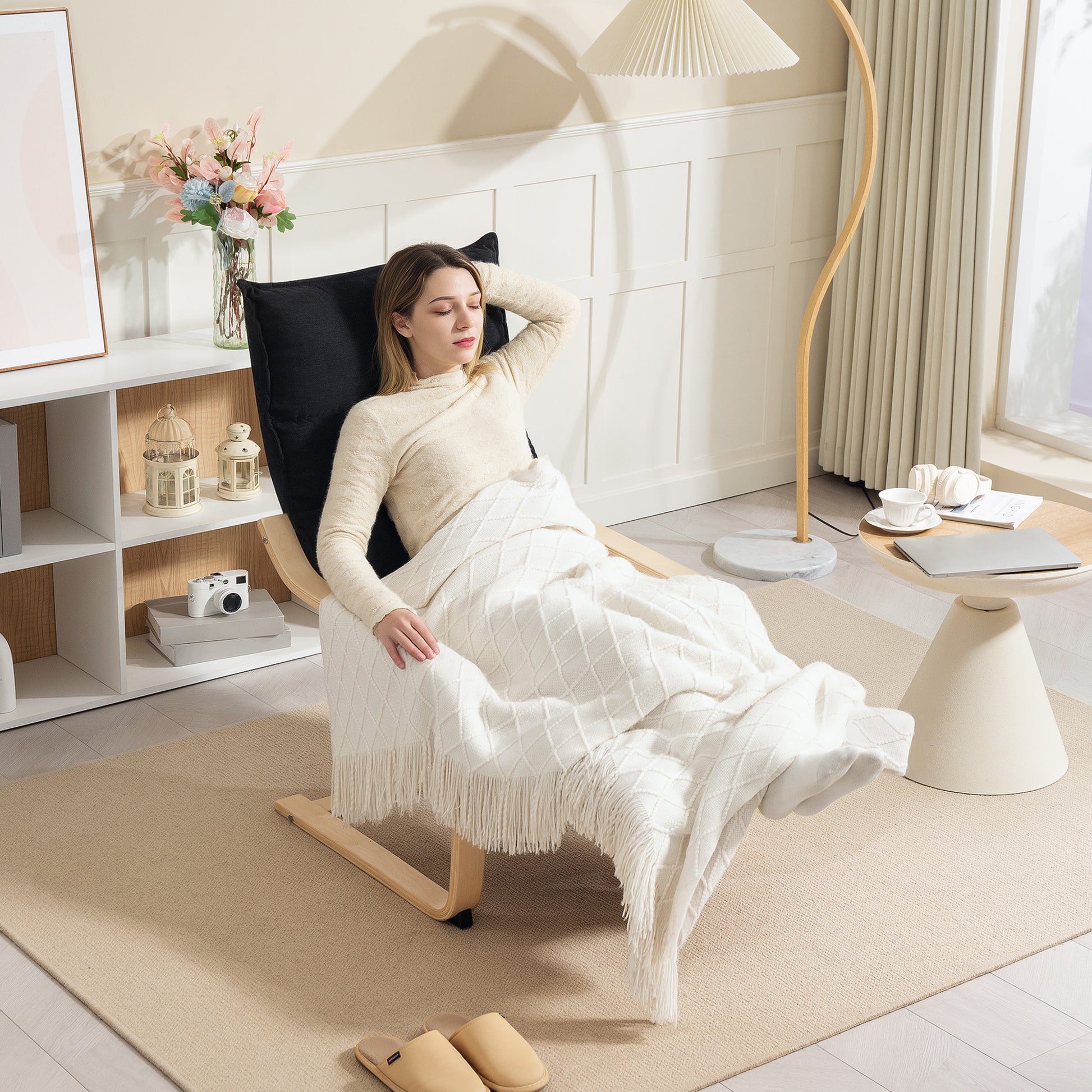 Wood Lounge Chair, Upholstered Recliner Lounge Seat with Adjustable Footrest, Armchair for Living Room, Bedroom, Balcony, Office, Black