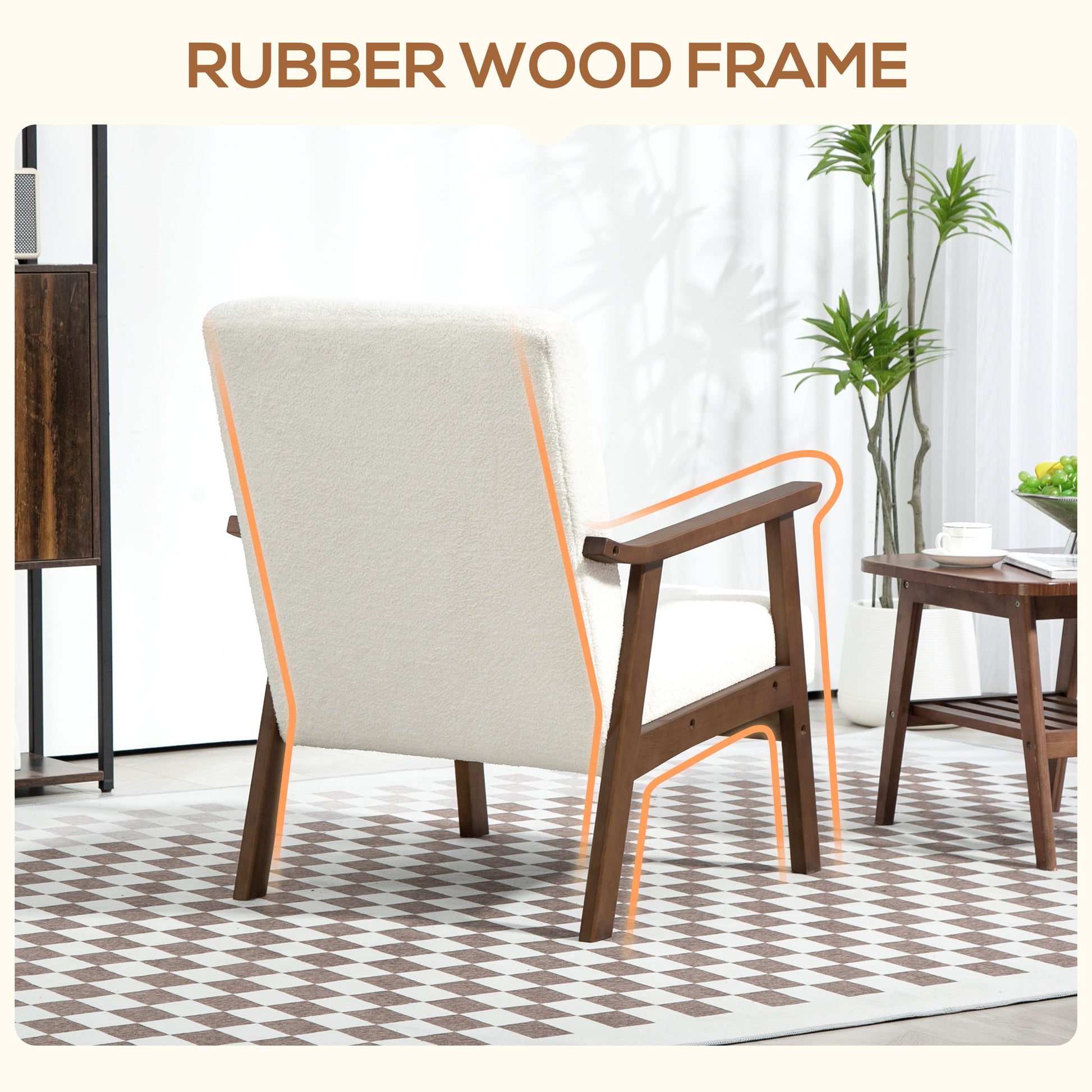 Soft and comfortable retro charm, in the form of this HOMCOM accent chair. The Mid Century design gives this comfy chair a relaxed design with the angled back and armrests, fitted with a large seat and back panel; padded with cashmere-feel boucle upholstery to sink into with ease. A wooden frame ensures this chair has a strong and supportive core. Use all throughout the home - wherever you want to bring plenty of character.