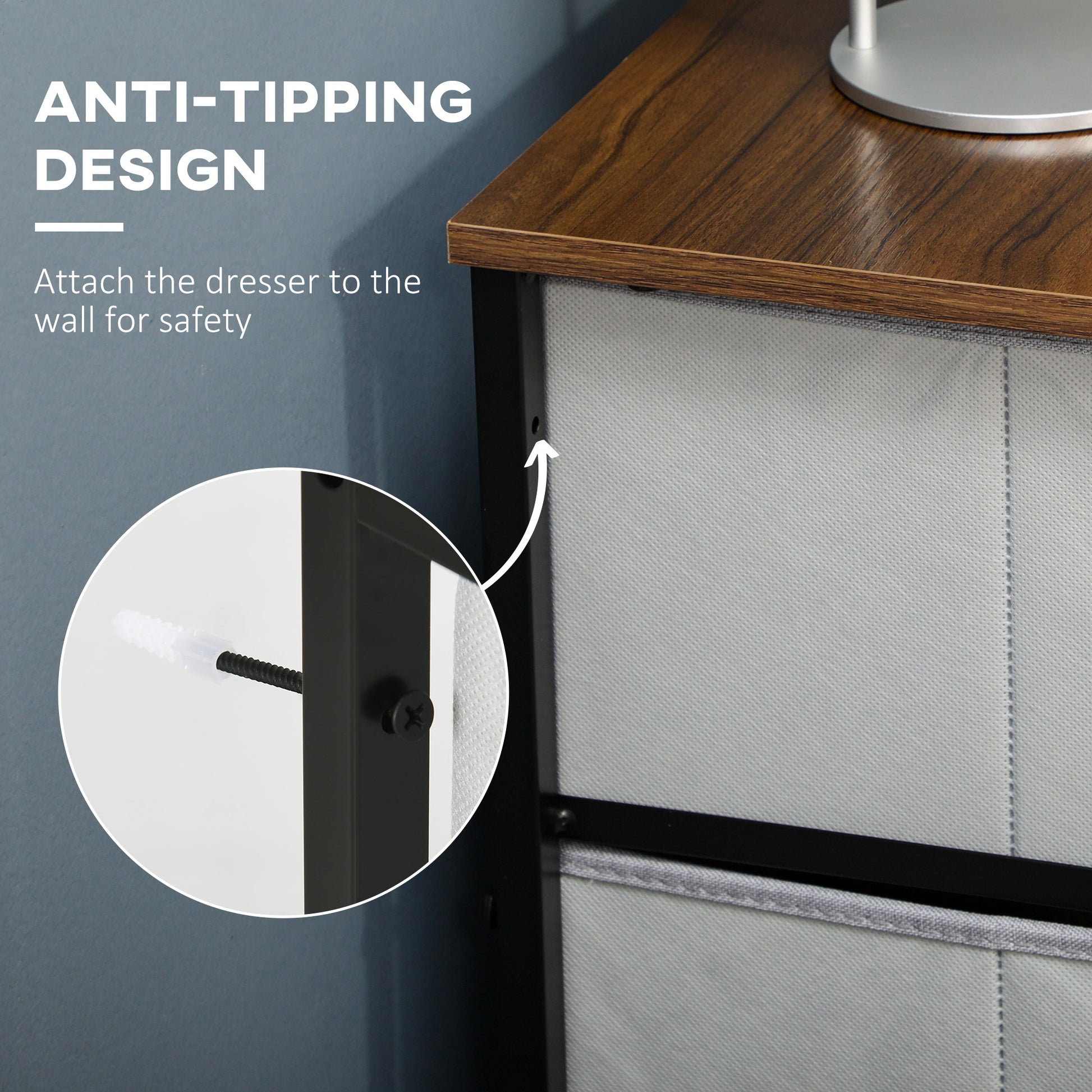 Home storage with this HOMCOM fabric chest of drawers. The six fabric drawers offer room for lots of things - keep t-shirts, tops, bottoms and more organised. The large space also makes it suitable for shared use. The wood-effect top offers more room: a great place to display your favourite photos. The steel frame makes a strong core, with adjustable feet for balance. Comes with anti-tipping straps for safety. Use all over the home and office.