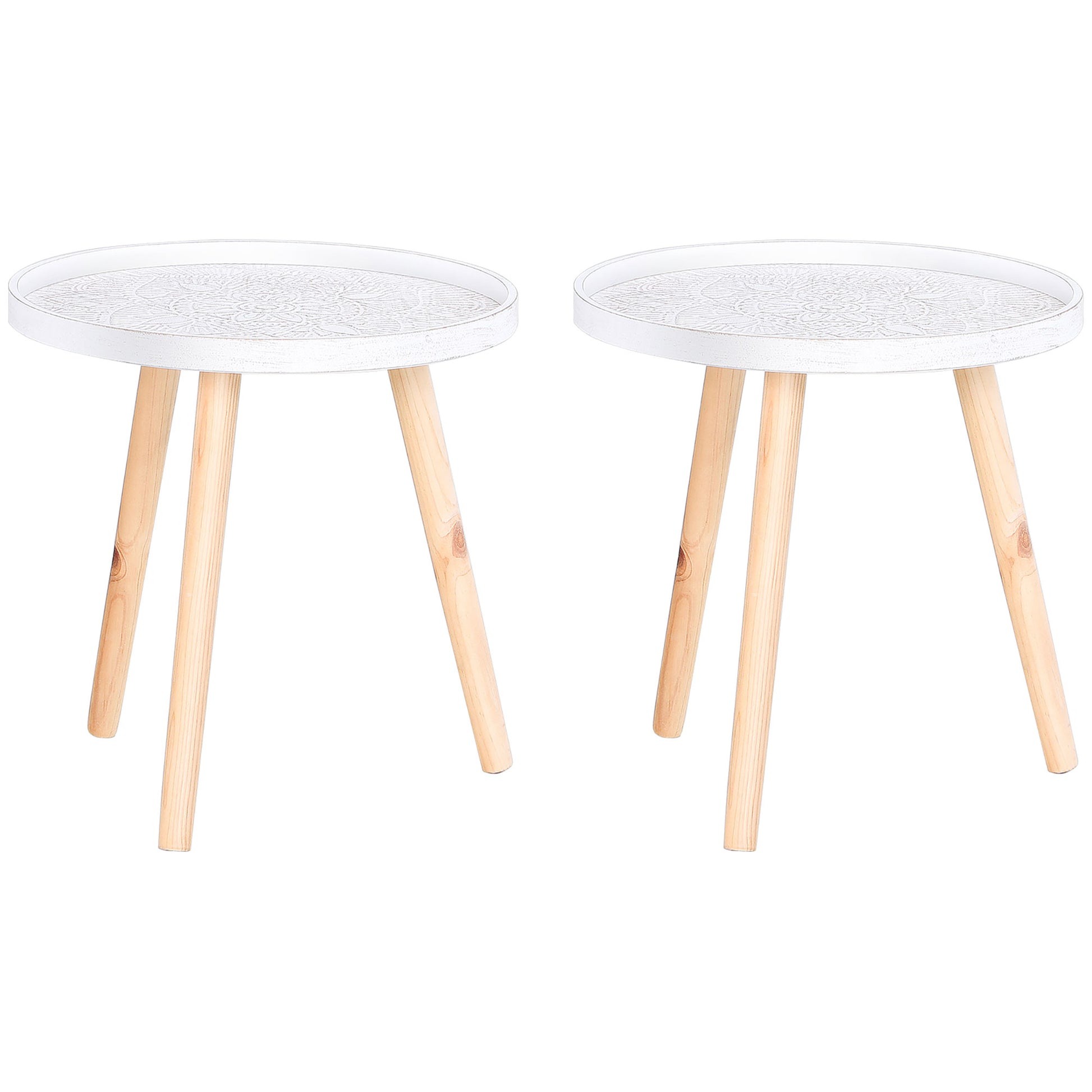 Coffee Table, Carved Floral Round Table with Tray-style Top and Wood Legs, Modern Side Table for Living Room, Set of 2, White