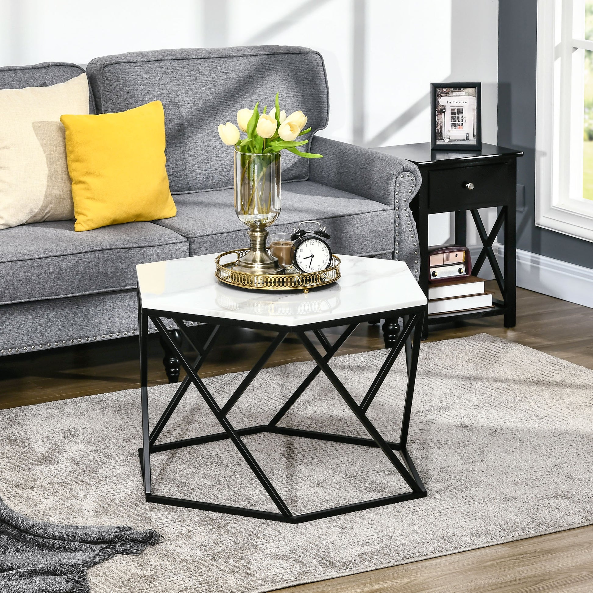 Coffee Table with High Gloss Marble Tabletop, Modern Cocktail Table with Steel Frame for Living Room, White