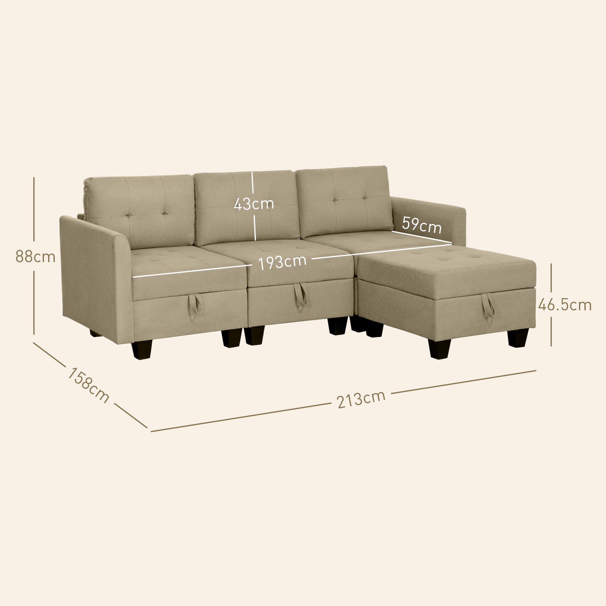 Convertible Modular Sectional Sofa with Storage, 3 Seater Sofa Set, L Shaped Sofa Couch with Ottoman, Wood Frame for Living Room, Light Brown