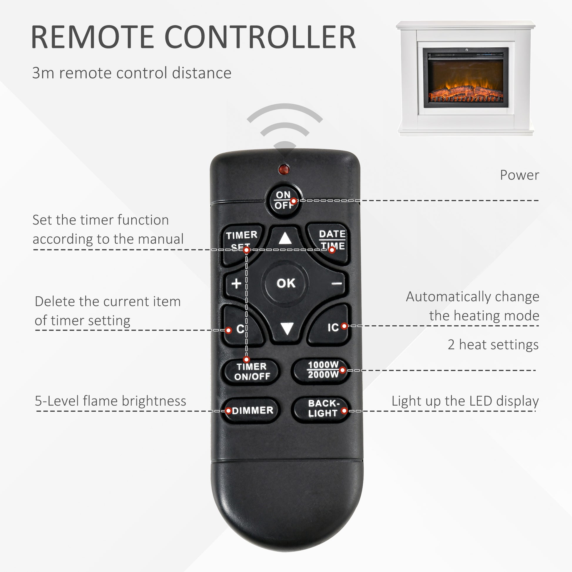 - 5-Level fire brightness, flame effect can be used independently without heat function