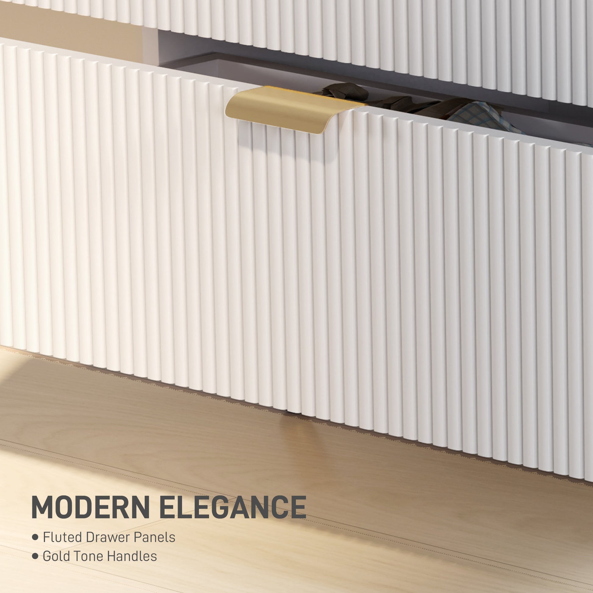 A bedroom essential, in bold and elegant style with this HOMCOM small chest of drawers. The ridged drawer fronts and gold tone handles add a beautiful touch to the solid colour. With four drawers and a flat tabletop, there's lots of storage for clothing and more; each drawer holds approx. ten T-shirts or five pairs of jeans. Complete with a metal legs for strong support.