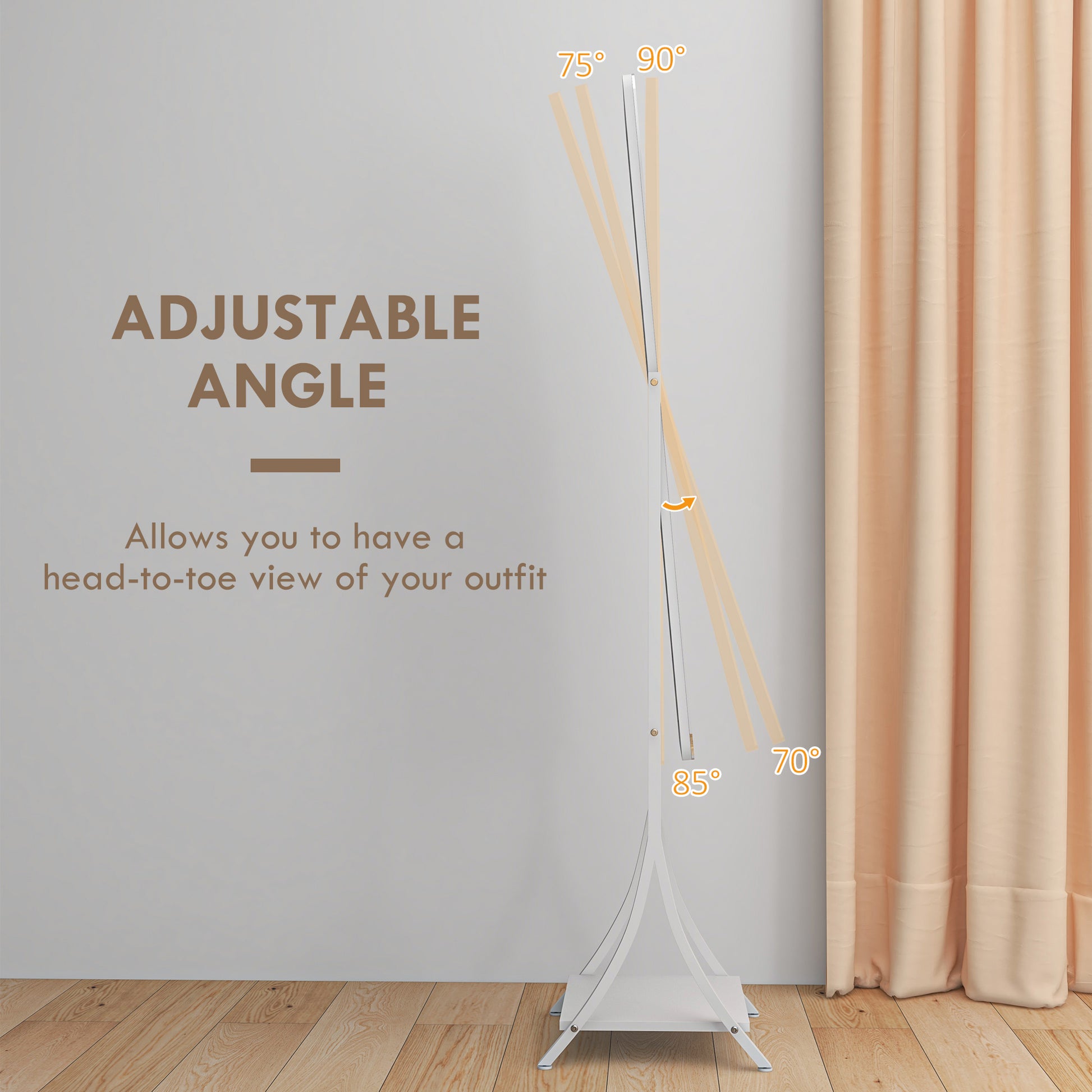 Illumination, day and night, so you can get ready - whenever. This HOMCOM full-length mirror is a classic piece, with a contemporary twist: it comes with an outer LED light to illuminate the mirror whenever you need it. Choose between warm white, white and cool white - with adjustable brightness too. Set the mirror angle to 70°, 75°, 85° or 90°; the full length size is perfect for seeing your whole outfit. Complete with a handy bottom shelf.