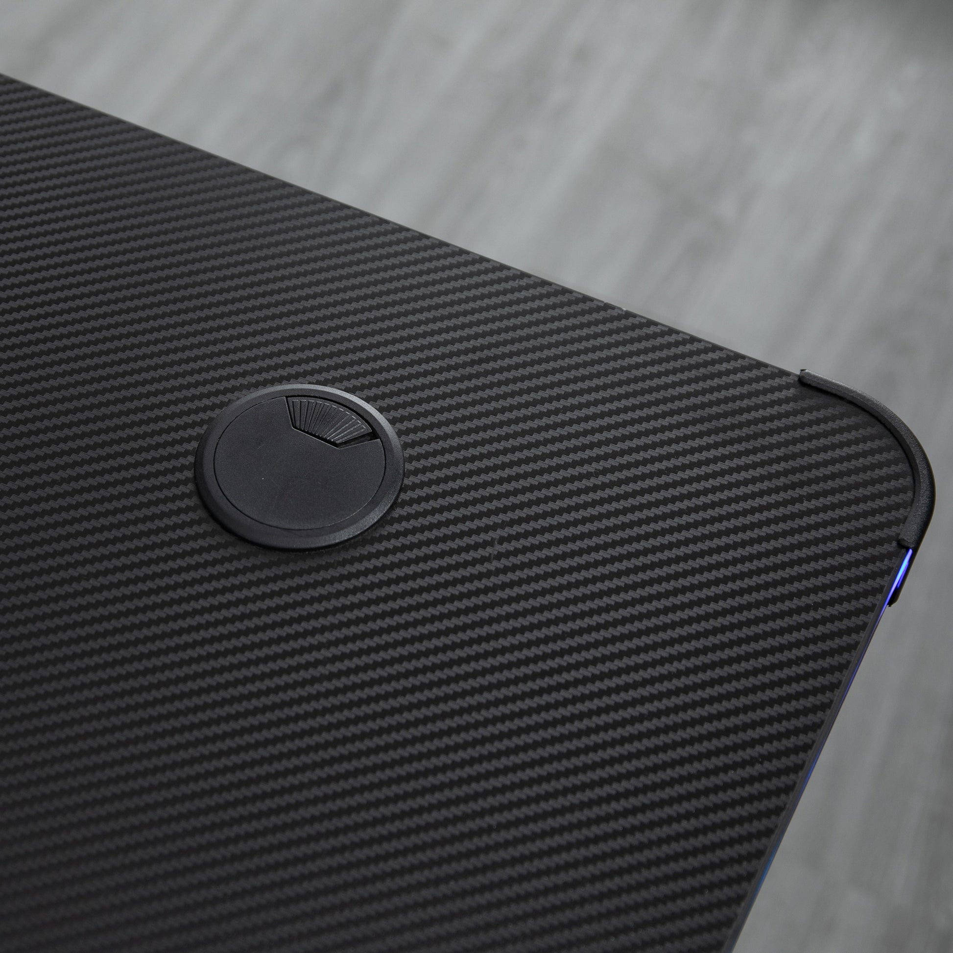Light up your gaming in cool style with this computer desk from HOMCOM. Using powder-coated steel for the frame, the gaming PC desk is formed into a 'R' leg design for balance, with adjustable foot pads to suit uneven floors. On each side there is an LED strip which lights up in an array of colours; brightness and speed can be controlled by the included remote: easy to pick a motion which you like. Corners are rounded for safety. Finished with handy headphone hook and cup and controller holder.