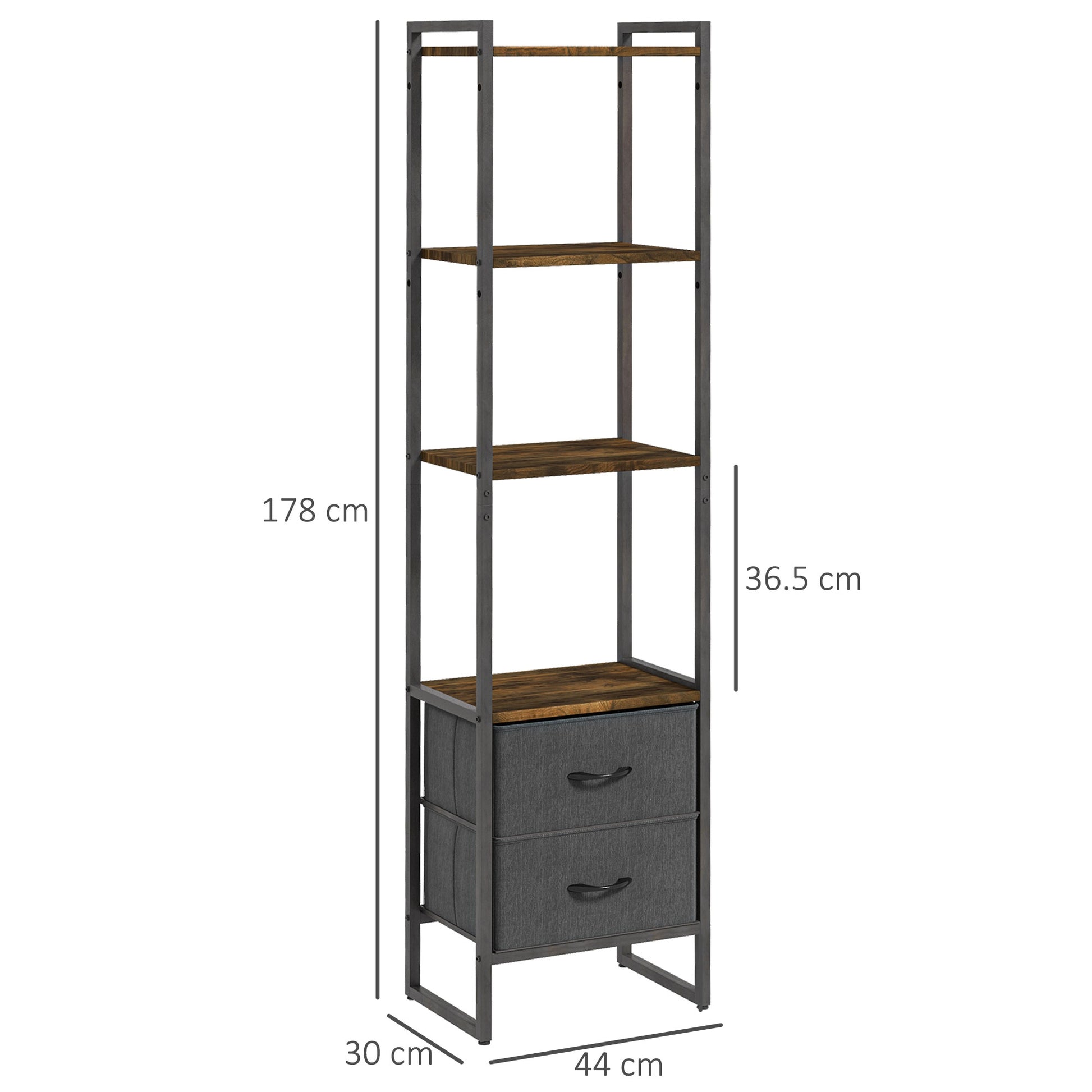 Industrial Bookcase 4-Tier Storage Shelf with 2 Fabric Drawers and Metal Frame for Living Room, Bedroom, Rustic Brown