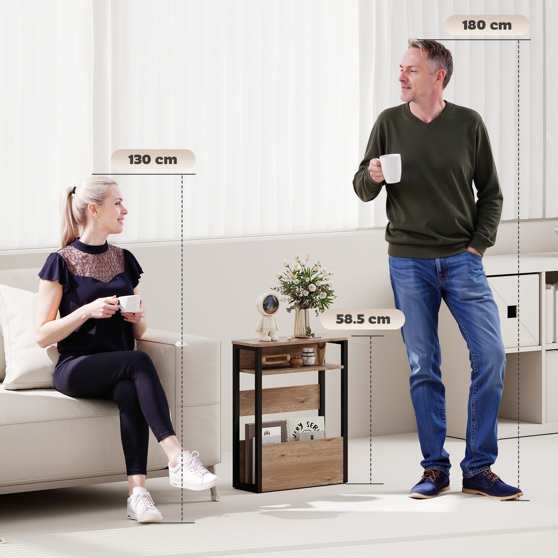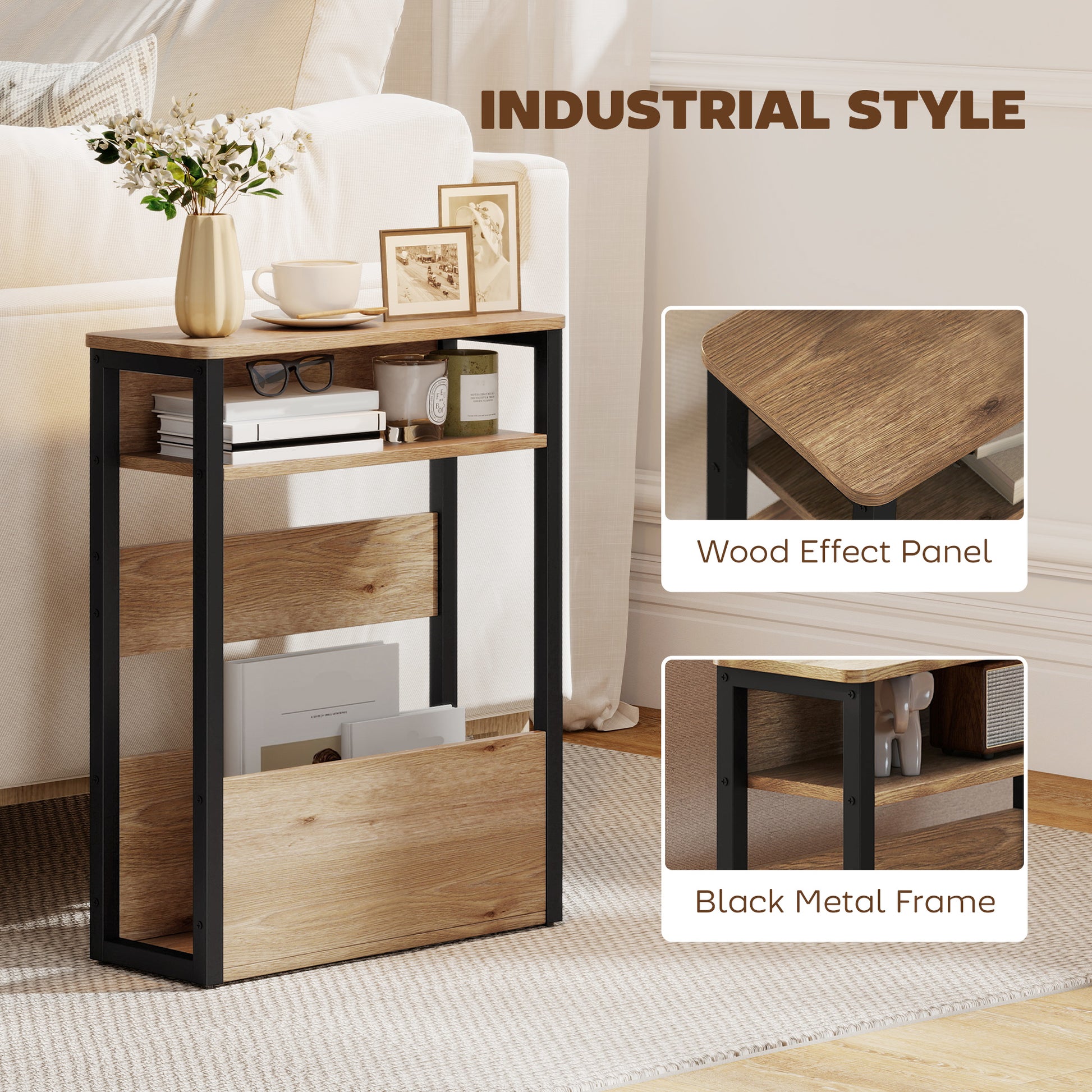 Easy industrial-style for the home with this HOMCOM small side table. A walnut brown wood-effect design, paired with a black frame, gives it a striking and stand-out look. The slim side table features two shelves and a tabletop for plenty of storage - use the occasional table as a nightstand or sofa side table. Complete with adjustable feet so it stands balanced at all times.