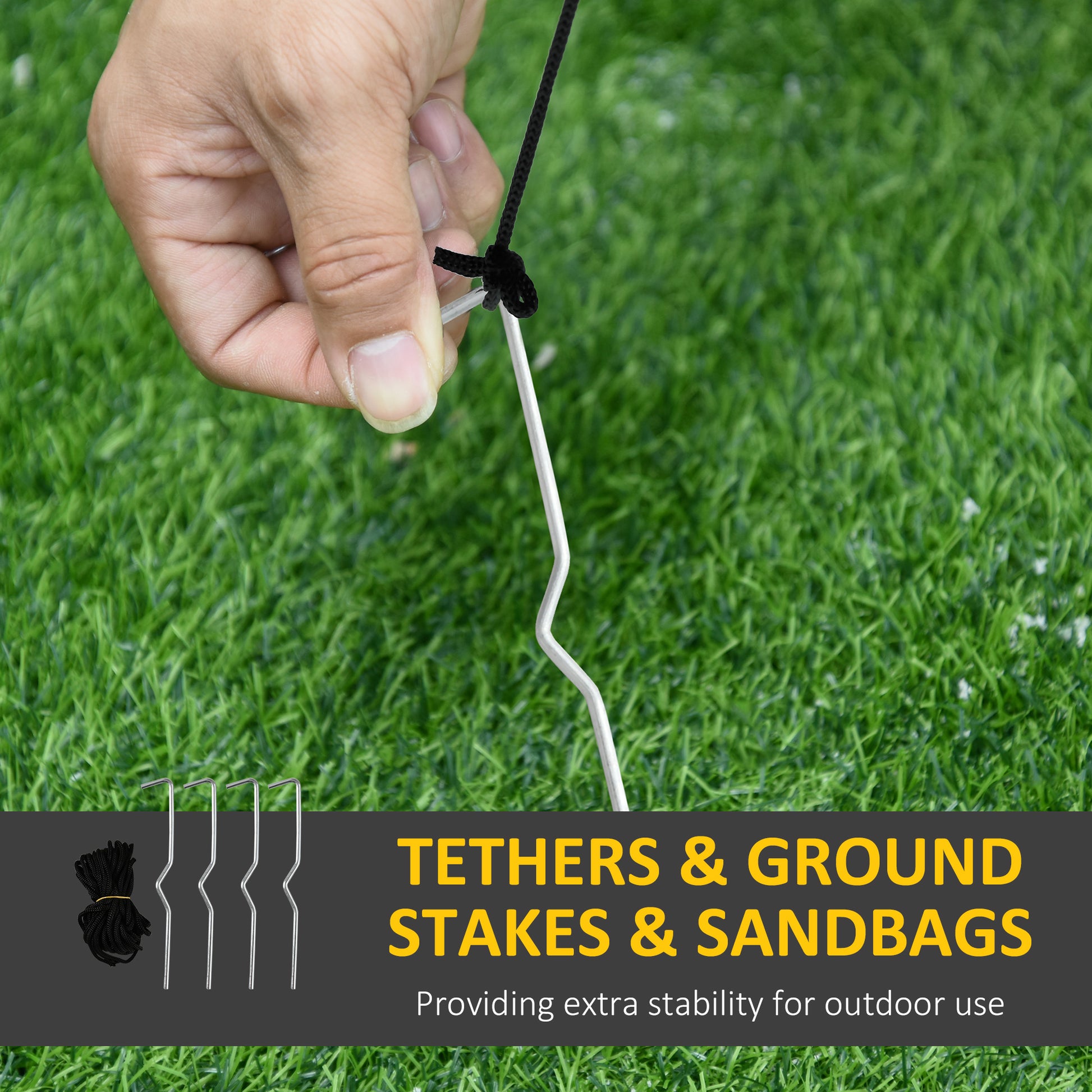 - Internal fan, four tether ropes and six ground stakes included
