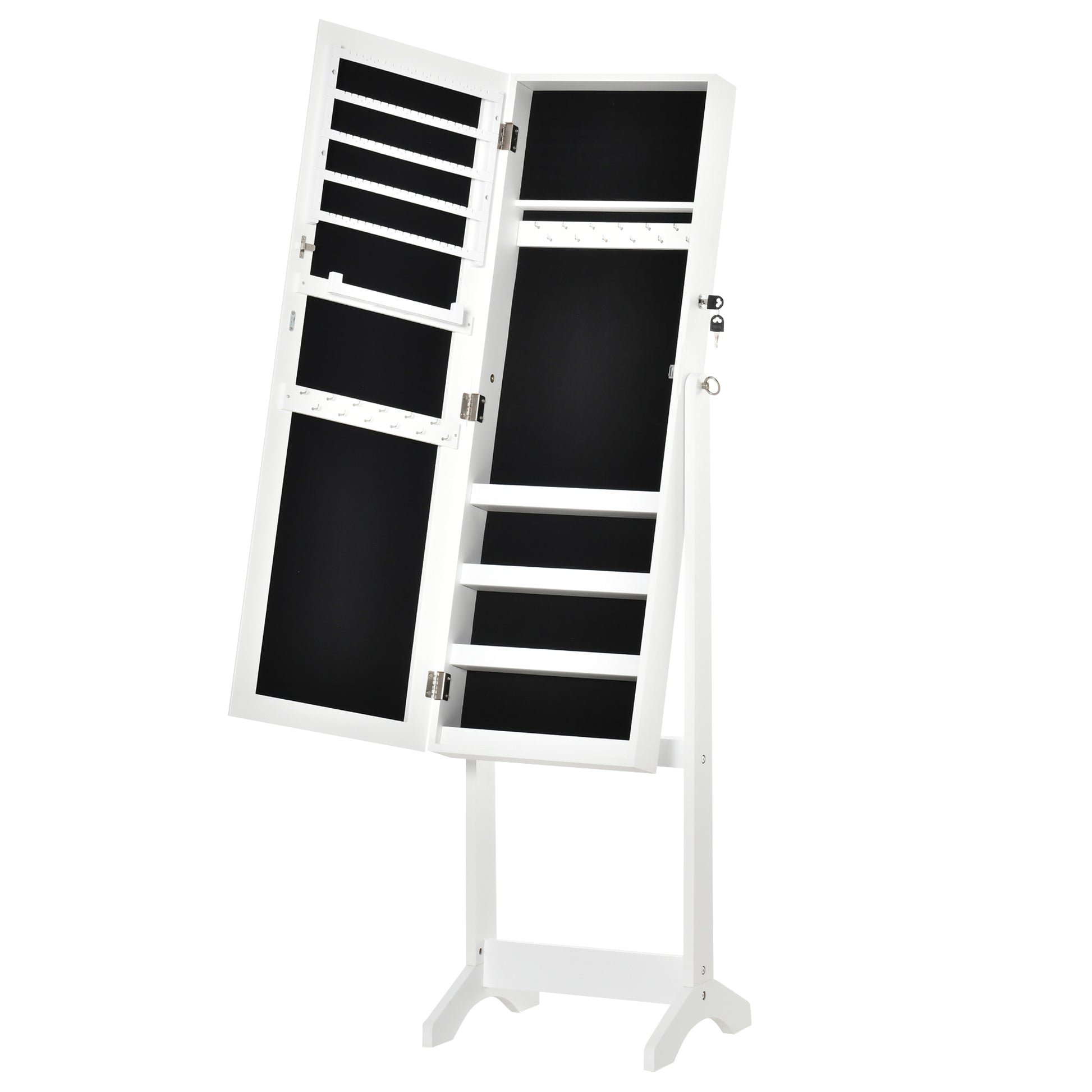Keep jewellery, perfumes, make-up and accessories organised and easily accessible with this HOMCOM armoire. On the outside, a full-length mirror is fitted, sets to three different angles. Inside, there are 100 earring slots, a bracelet hanger, 24 necklace hooks, 105 ring slots and four shelves - plenty of storage room, you can keep everything together at once. Complete with a two-feet base for balance.