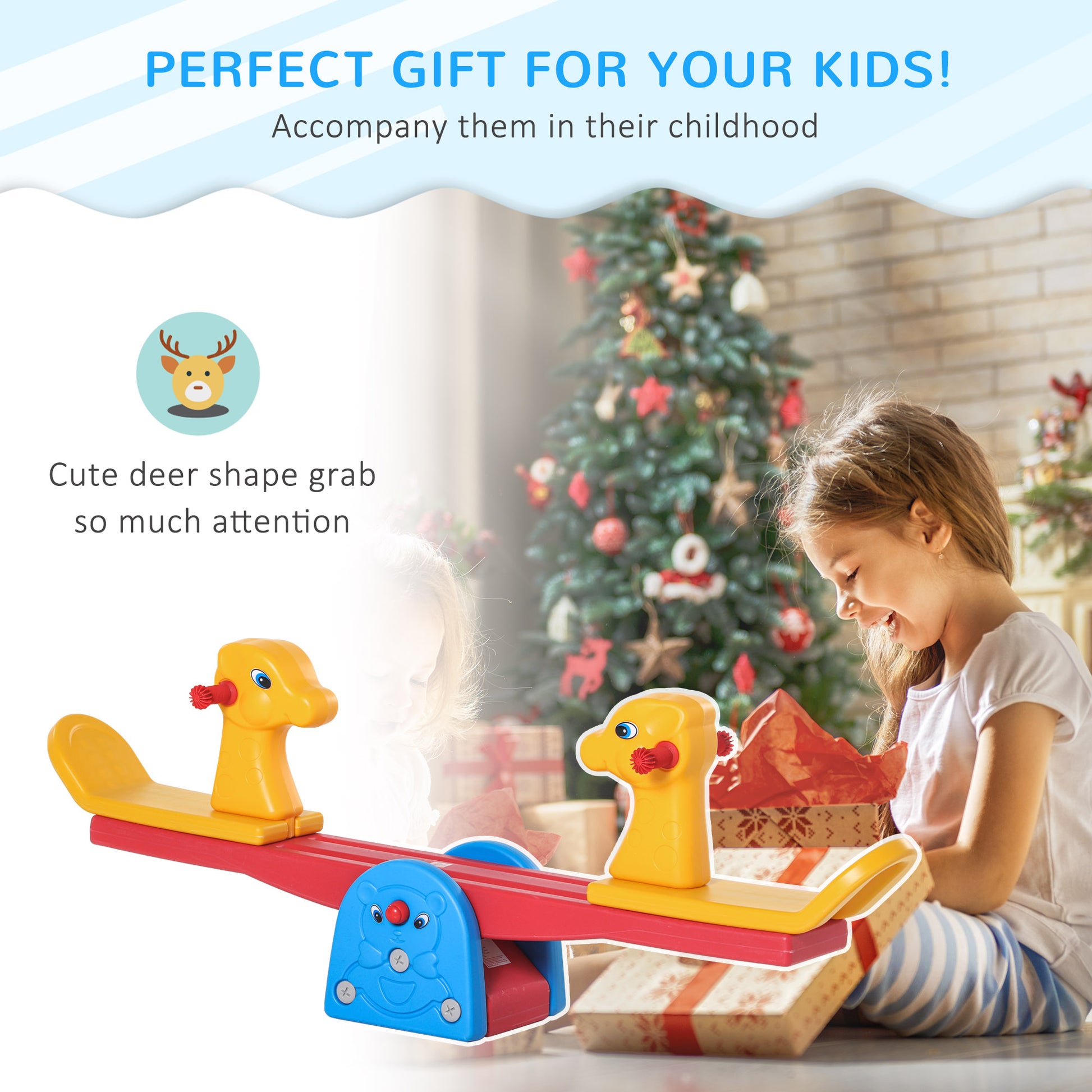 This HOMCOM kids seesaw is formed of a sturdy plastic frame, easy-grip handles and a safe seat - meaning your child can have fun whilst feeling protected. It’s suitable for ages 1-4 years. A cute and colourful animal design, both seats are fitted with a backrest, so they don’t fall backwards and harm themselves. Made from plastic so it can be used indoors and outdoors, it’s fitted on a large base which keeps it balanced when in use.