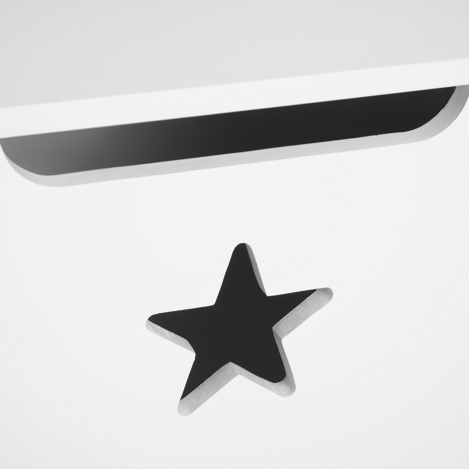Made from MDF and crafted into a spacious 46.5 x 62cm design, this fresh white storage box is the perfect addition to your child's room to store all their toys, books and odd bits and bobs. Sturdy in construction to suit children of all ages, it features a handle-style groove and safety hinge to lift the lid up easily and keep it in place, two handles for easy carrying and an elevated base for extra protection to the box. Finished with a cut-out star on the front for extra character.
