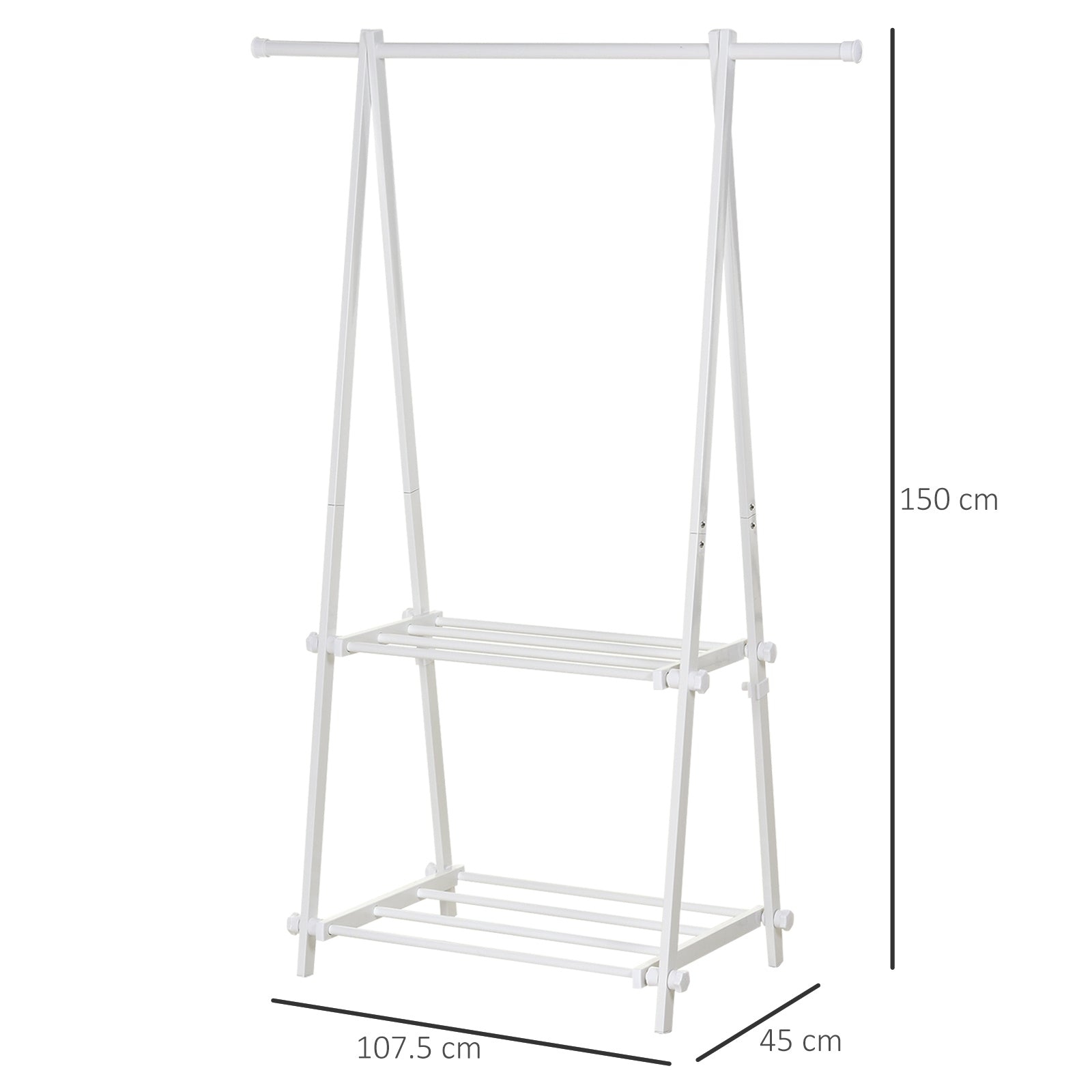Keep your clothes neatly organised thanks to this rail from HOMCOM. Powder coated steel forms the frame for a tough and reliable structure which can hold up to 20kg, and it's 'A' shape promotes balance even when fully loaded. It's made with two slatted shelves on the bottom for extra storage, and is finished short legs for extra stability. Fresh white colour for elegance.