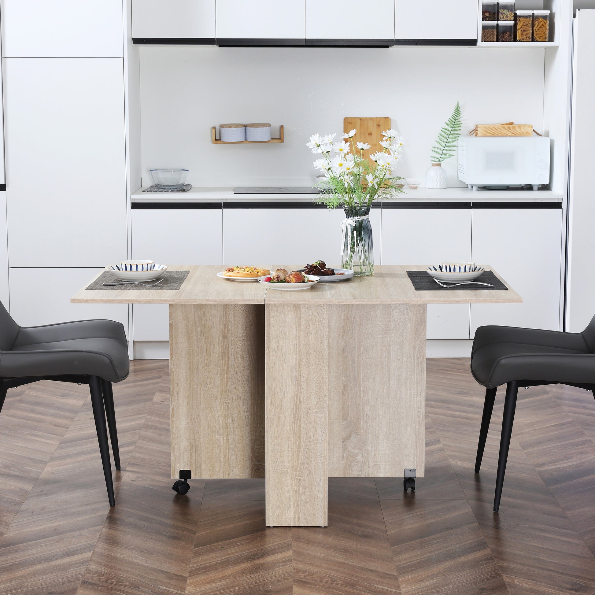 Make large unused tables at home a thing of the past. Choose this HOMCOM drop leaf dining table for extending surface space, whenever you need it. Both sides lift up and drop down super easily. Inside there are two shelves for close by and discreet storage - easy to keep things close to you. Complete with wheels to move easily, with brakes so it stands still, whenever you want.