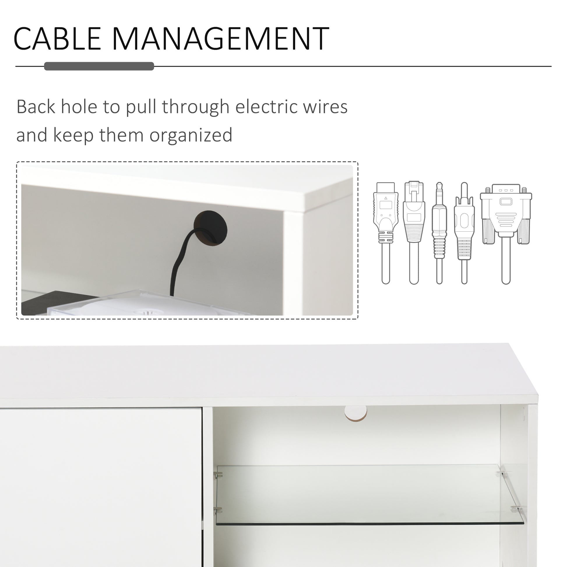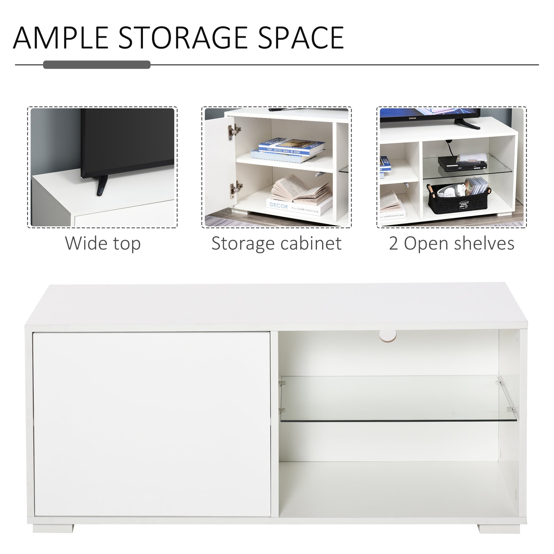 The clean design of this HOMCOM TV unit makes it an all-round winner for every home. Fresh white in finish, it's crafted into a boxy rectangular shape, meaning it can effortlessly pair with other furniture. This tv bench features a cabinet on the left for off-display storage, with two open glass shelves on the right, which is a must for any media devices and consoles. There is a cut-out hole on the back to feed wires through, and the flat table-top offers extra holding room.