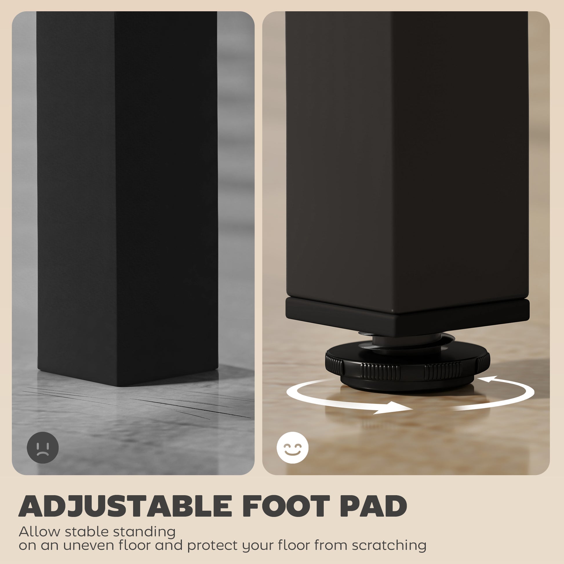 - Adjustable foot pads keep the table stable and protect floors from scratches