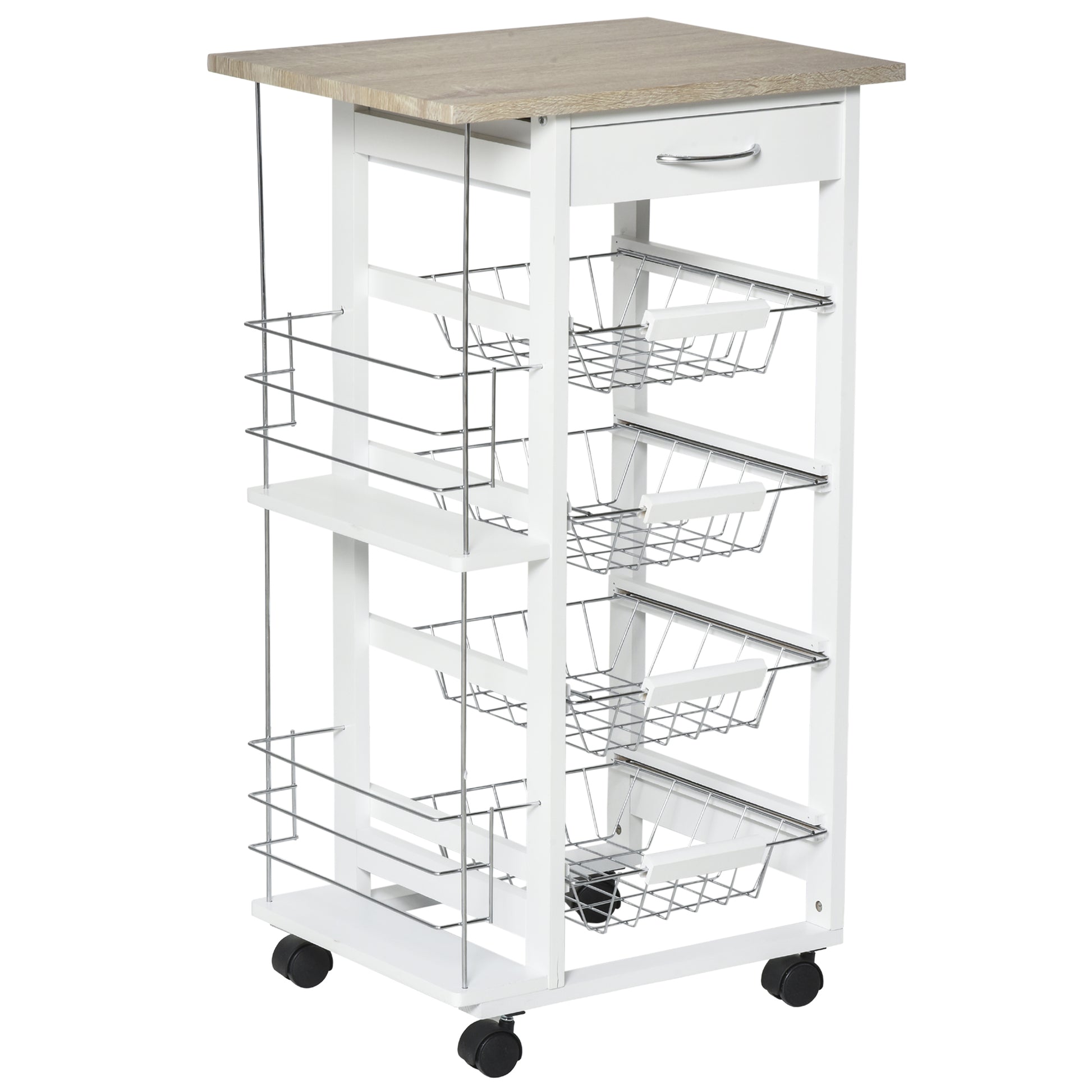 Rolling Kitchen Cart, Utility Storage Cart with 4 Basket Drawers & Side Racks, Wheels for Dining Natural / White