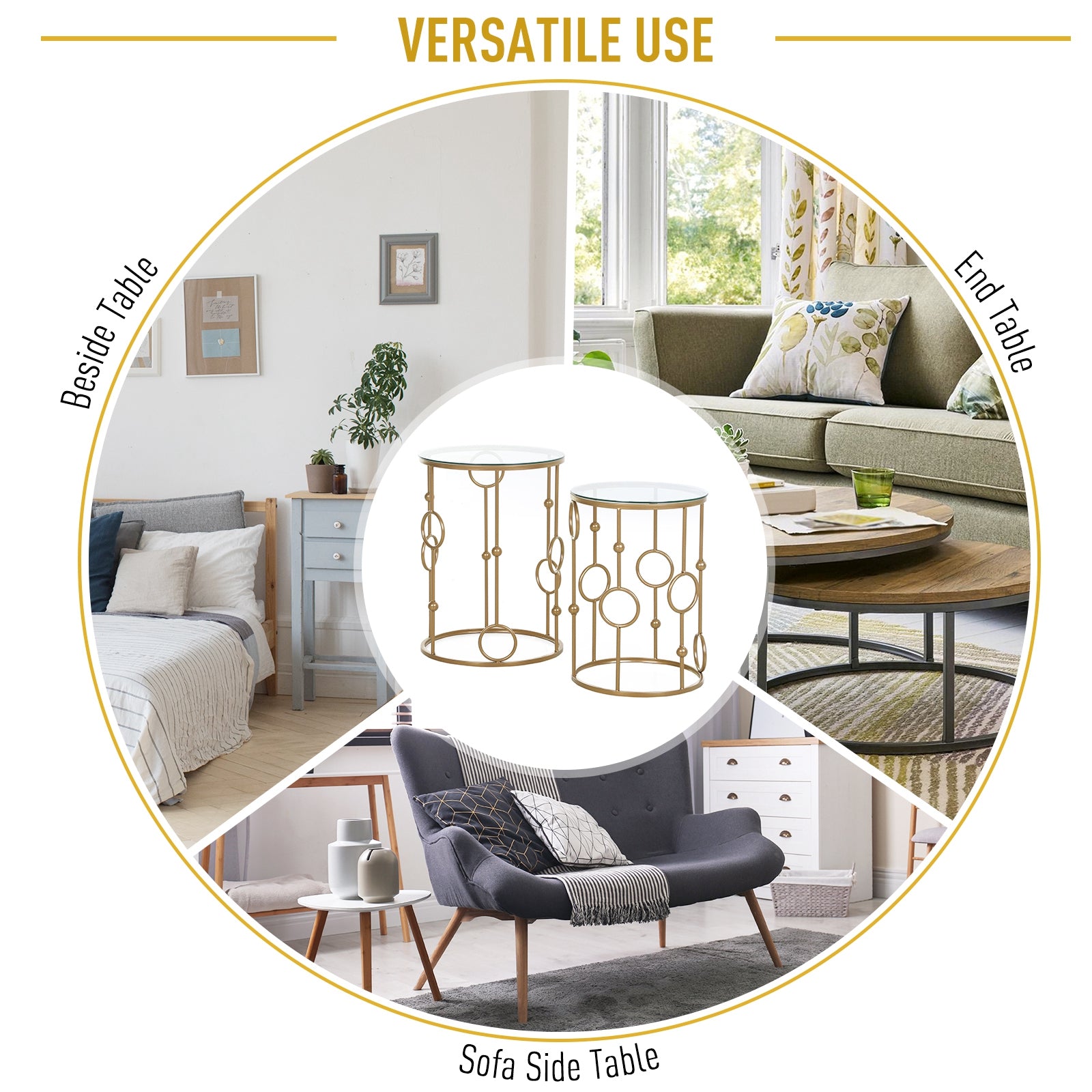 A striking frame design, paired with the luxe golden colour, makes these two side tables a glamorous addition to your home. The frames, made from metal, are crafted into a cool hoop and ball design, covered in water-resistant paint for extra protection. The table tops are made from safe tempered glass to offer a solid and sleek resting place. Set comes with one big table and one smaller, allowing you to neatly tuck the latter into the larger one for excellent space saving.
