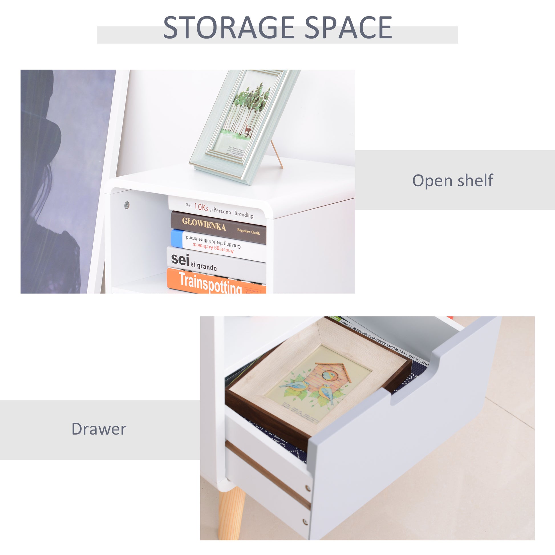 This classic Scandinavian styled living room table from HOMCOM is a perfect addition for your bedroom. Made from pine wood and MDF for long term use. Features a small open shelf and a grey lower drawer, providing sufficient space for your daily essentials. Easy to clean and maintain with painted surface.. This bedside table can be used as a sofa table, night stand, corner table etc. Bring style and functionality to your home with this wooden night stand!