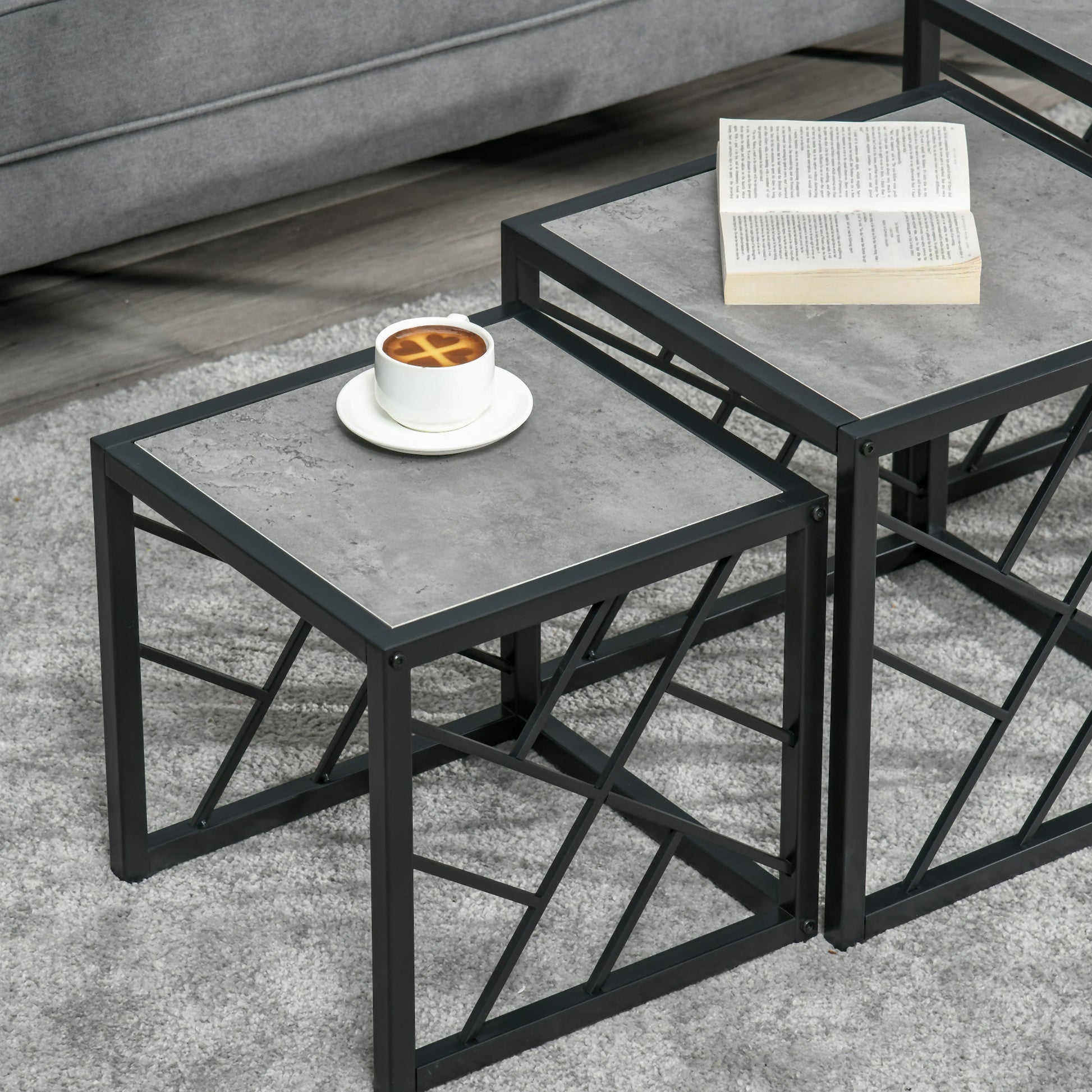 Set of 3 Nest of Tables, Square Side Tables with Black Metal Frame, for Living Room, Bedroom and Office, Grey