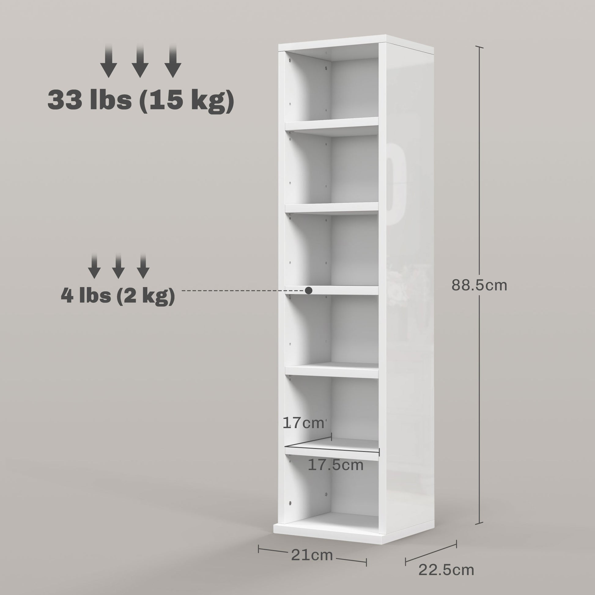 - Dimensions: 88.5H x 21W x 22.5Dcm. Shelf: 12.5H x 17.5L x 17Wcm. Shelf adjustable height: 3.2cm