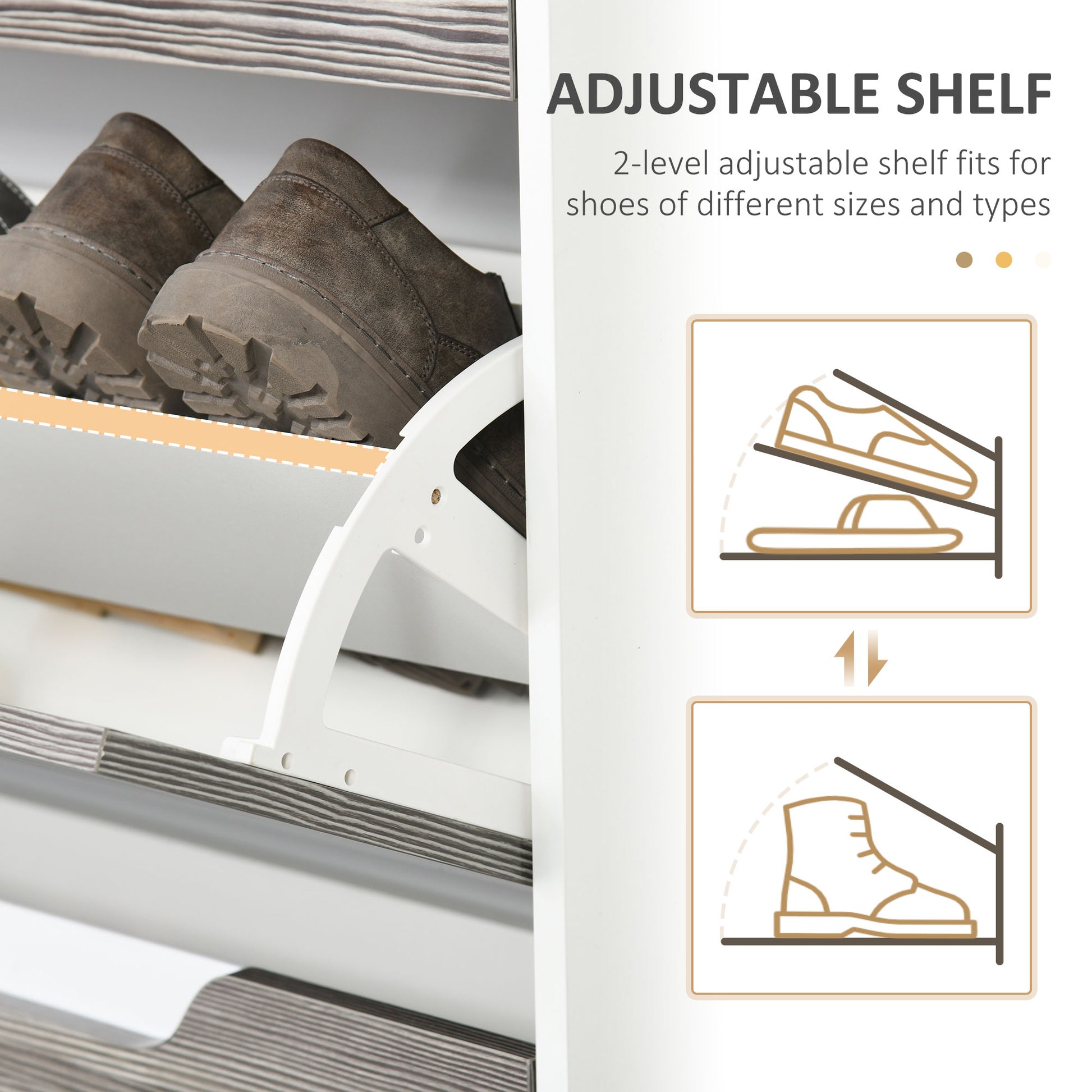 Give shoes and more somewhere stylish and protective to keep them - grab this narrow shoe cabinet from HOMCOM. There are two flip drawers, each can hold eight pairs - perfect for use with the family or your flatmates. The inner shelf can be set to two different positions for storage which fits your shoes better. This tall shoe cabinet is made from a blend of MDF and particle board, so it’s durable. Finished with a handy top drawer and glass shelf, offering even more storage and display space.