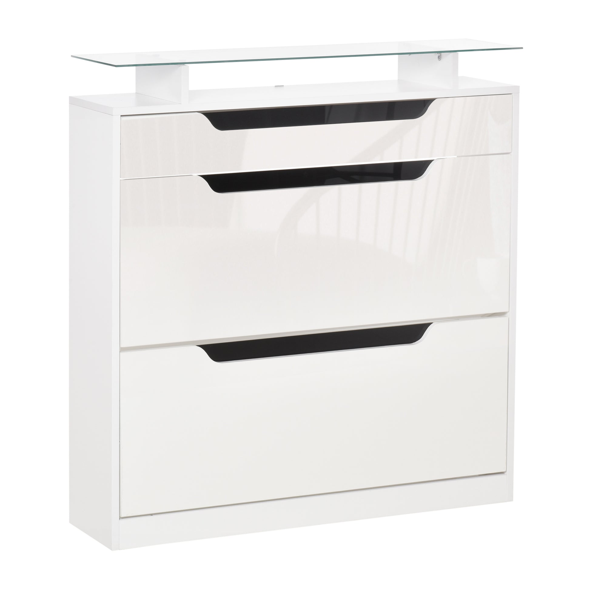 Shoe Cabinet with 3 Drawers High Gloss Storage Cupboard Tipping Bucket with Flip Door Glass Top Adjustable Shelf Large-Capacity for 14 Pairs