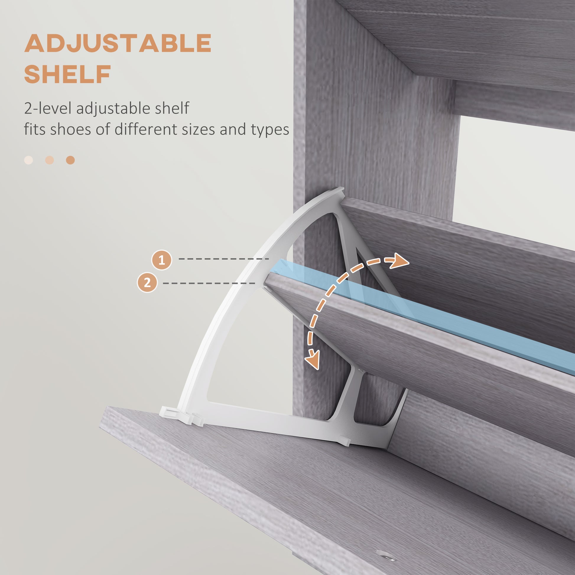 Made for the narrow spots, this HOMCOM slim shoe storage unit is here to keep the home clutter-free from shoes. Three flip drawers hold up to 12 shoe pairs - great for the household - or the individual shoe lover! Made from particle board, this shoe storage unit is sturdy and suitable for the everyday, with the paneled-door design giving it a modern look. Comes with anti-tipping straps to secure to a wall safety.