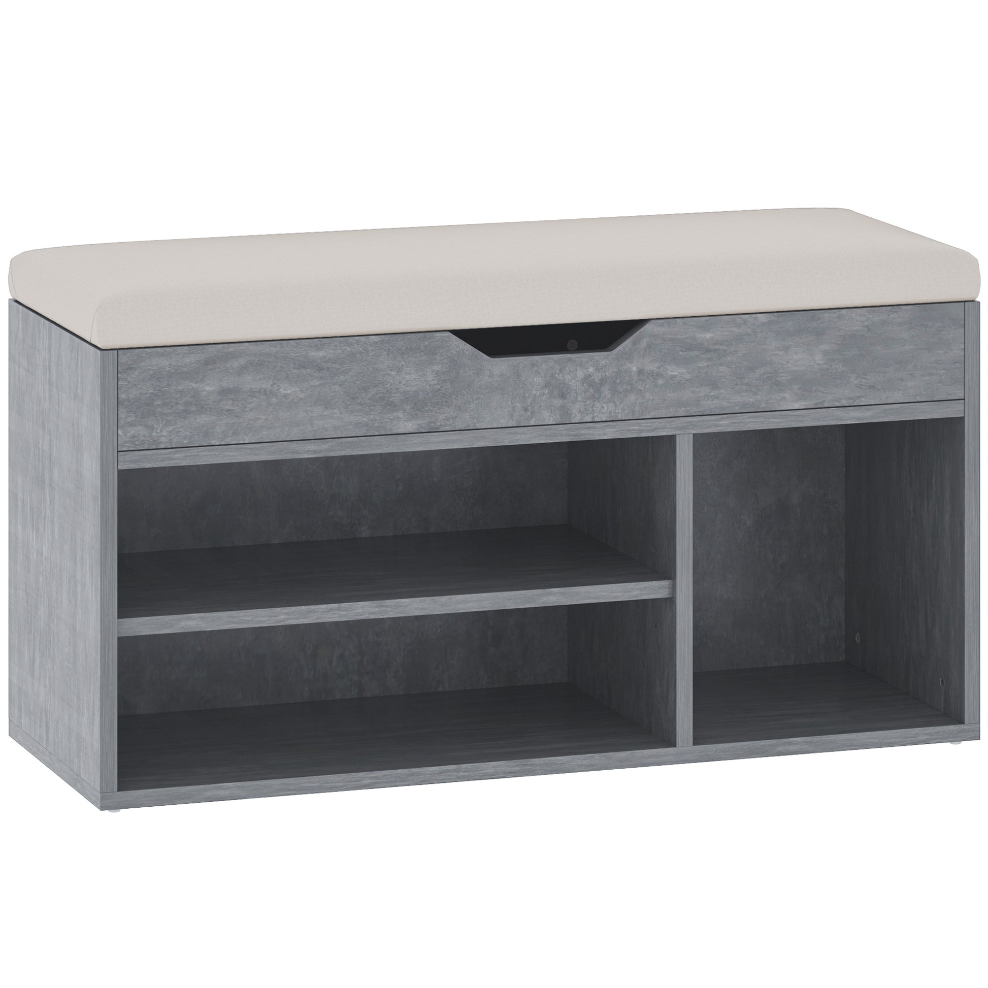 This stylish shoe storage unit from HOMCOM is excellent for all homes. It is crafted from engineered wood for a strong and stable structure, in a grey wood effect for beauty. It features three open compartments: spacious in size for keeping your shoes, with a concealed spot on the top for keeping other bits stored. Thick cushion sits on top, keeping you comfortable as your sit, with side groove handles so you can move it around easily.
