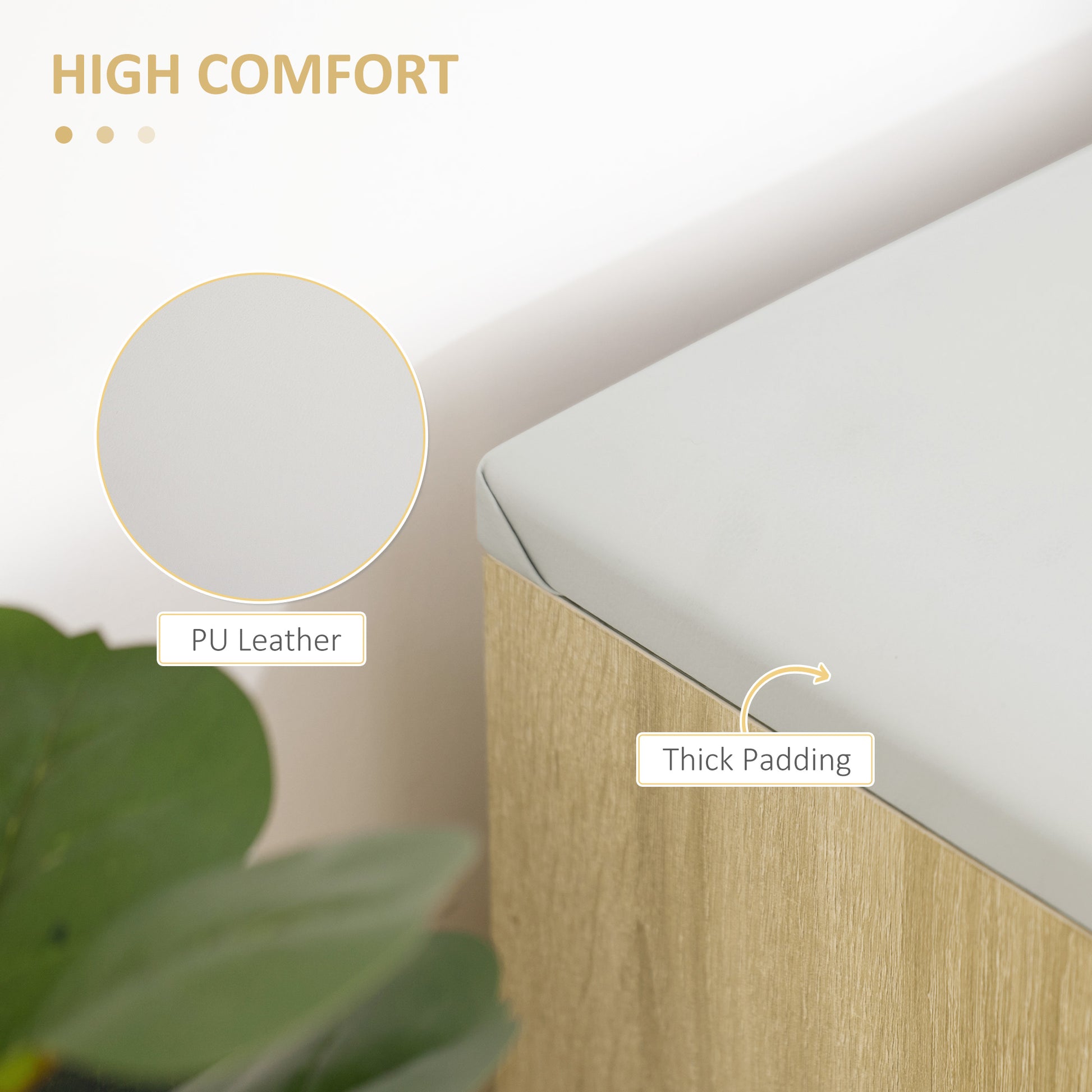 This stylish shoe storage unit from HOMCOM is perfect for all homes. It is crafted from MDF for a sturdy and durable structure, in an oak tone finish for beauty. It features three open compartments: spacious in size for keeping your shoes, with a concealed spot on the top for keeping other bits stored. Thick cushion sits on top, keeping you comfortable as your sit, with side groove handles so you can move it around easily.