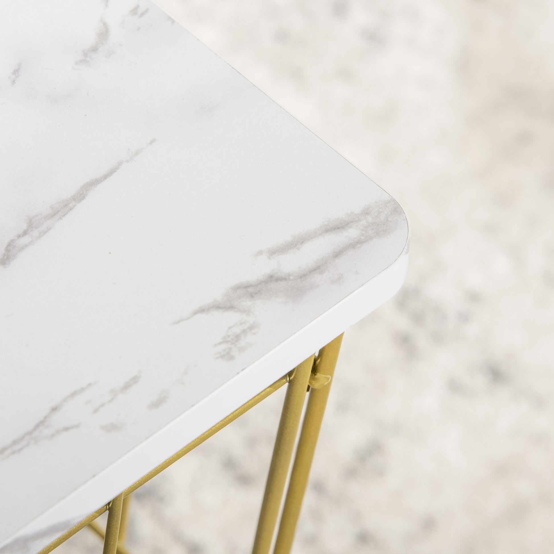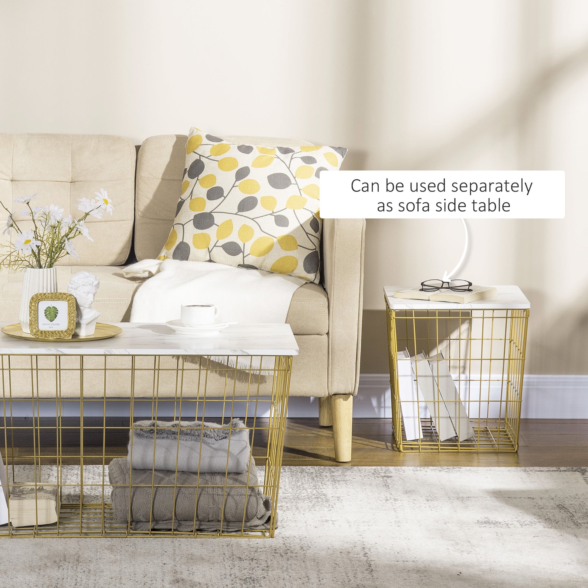Side Table Set of 2 with Wire Storage Basket, End Tables Coffee Tables with Faux Marble Top for Living Room Bedroom, White and Gold
